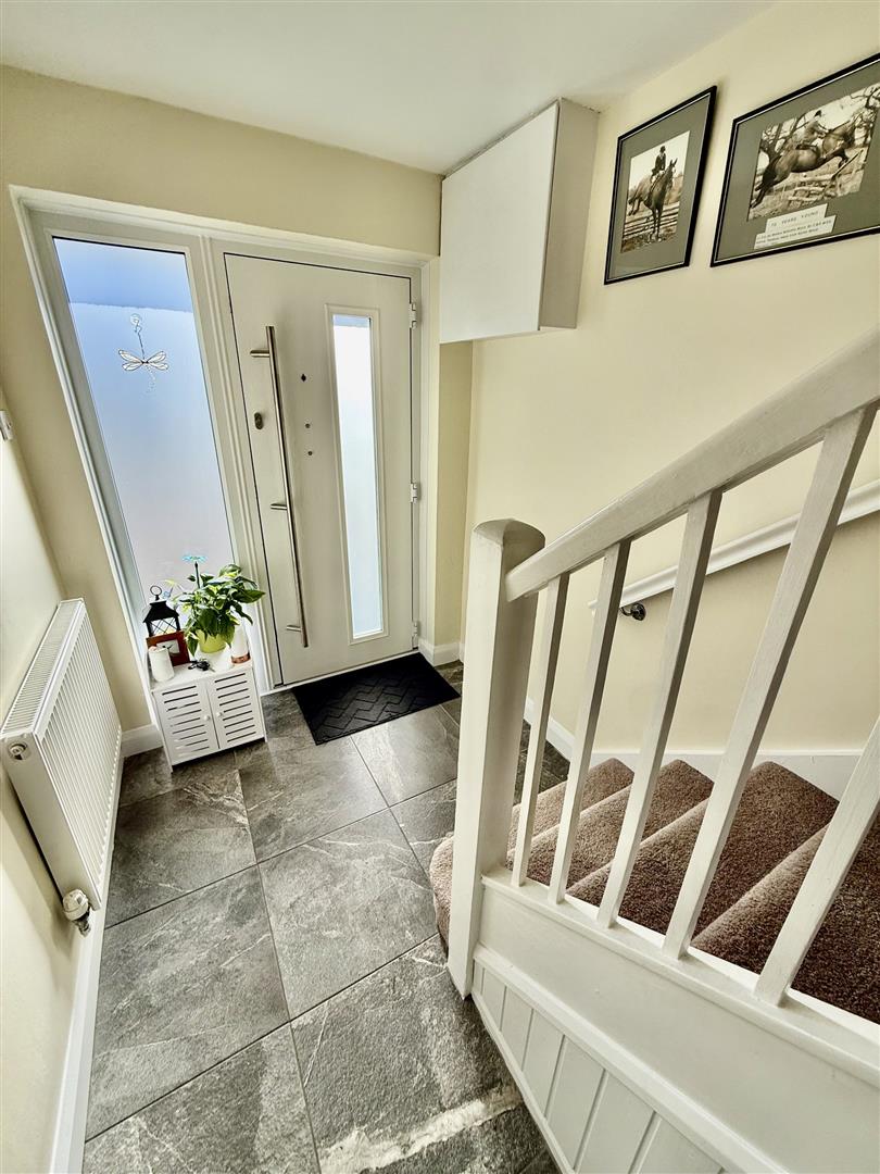 The property is accessed by a covered porch through a part glazed door to the front of the property in to the hallway. The hallway has a tiled floor, understairs storage cupboard and stairs to the first floor with doors to all bedrooms. A door leads through to the kitchen.