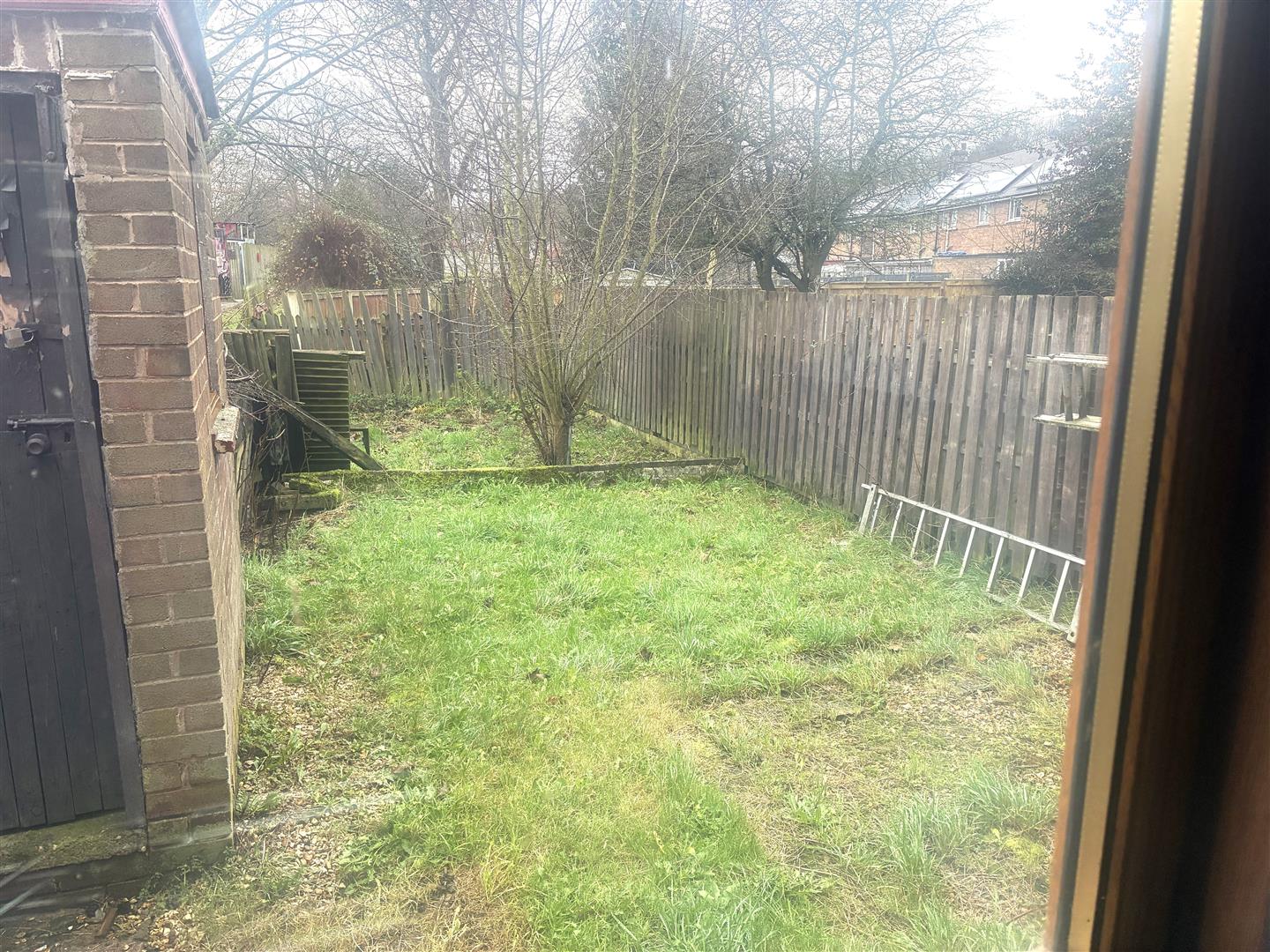 To the rear laid mainly to lawn with a brick-built outbuilding.