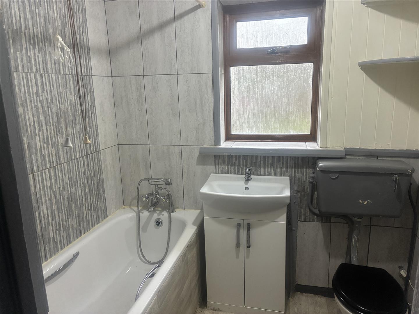 Fitted with a panelled bath and electric shower over, low-level WC, and vanity wash basin unit. Opaque rear window and partially tiled walls.