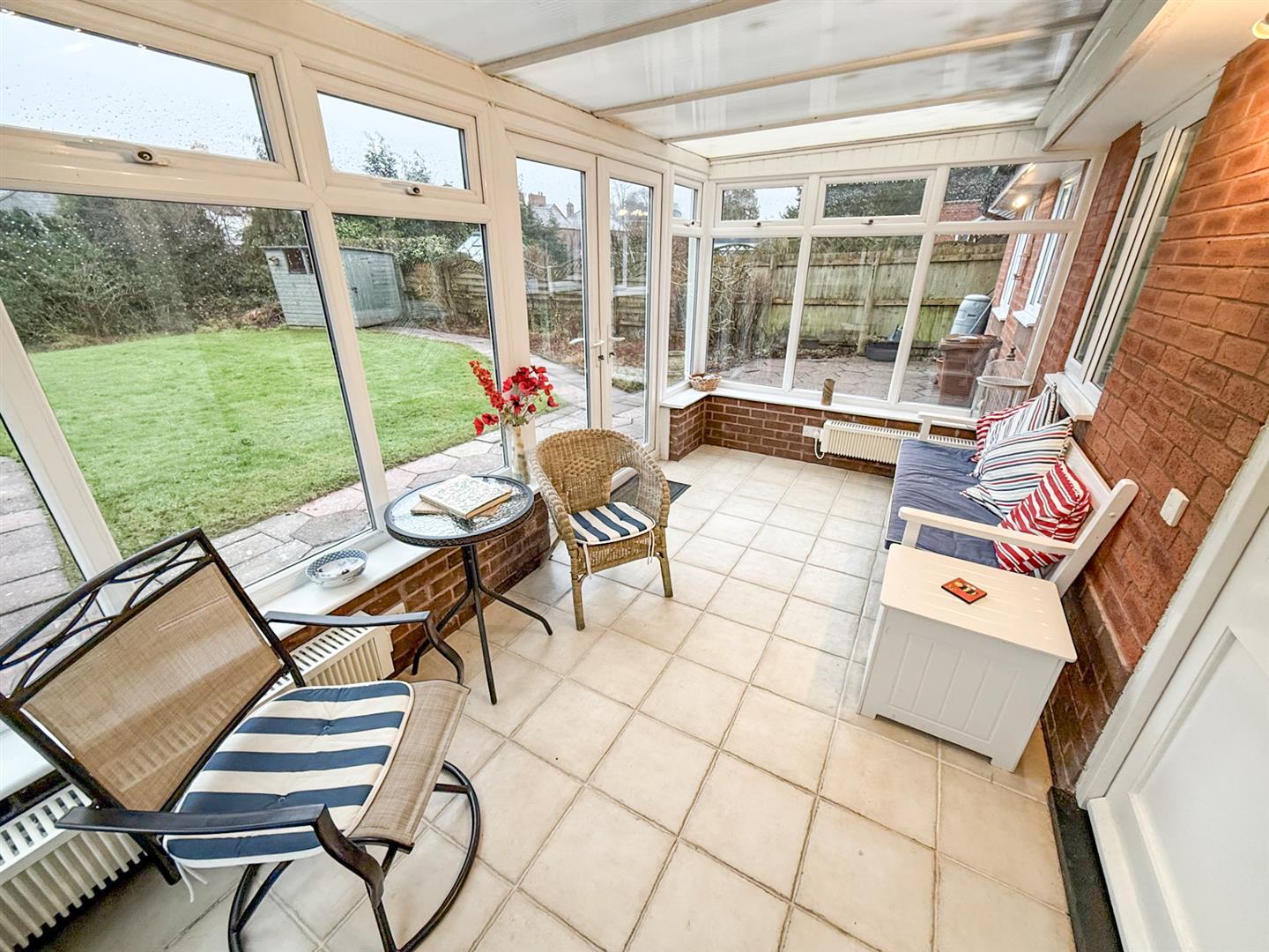 The bright, spacious conservatory has a tiled floor, electric radiators and French doors leading to the rear garden.