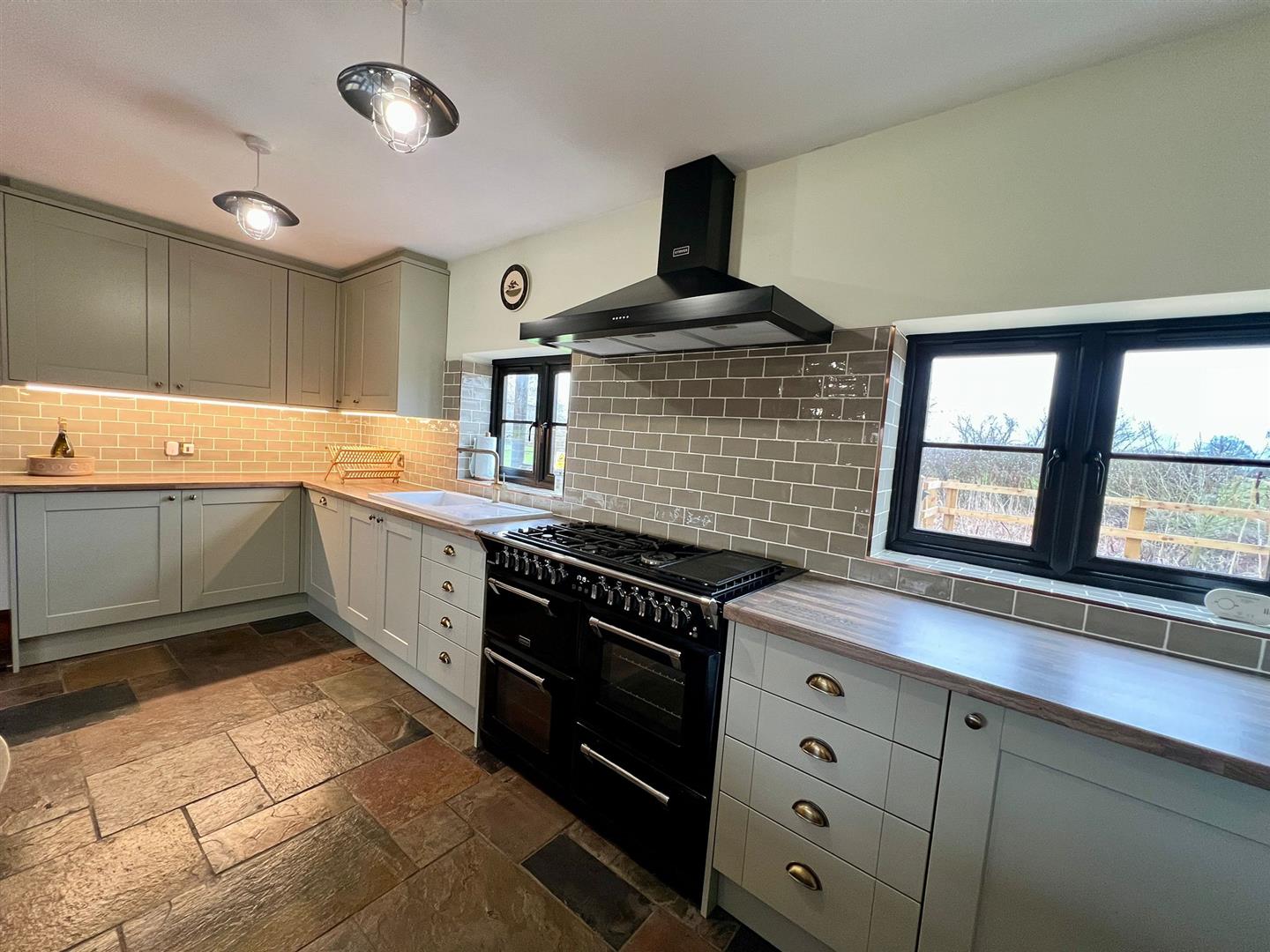 With a tiled floor, a fully fitted Kitchen comprising a single drainer 1.5 bowl sink unit (H&C) with mixer tap and cupboards under, an extensive range of roll topped work surfaces to either side with base units below, wall tiling, an integrated 4 ring hob unit with fitted extractor hood above and oven below, an integrated dishwasher and refrigerator, matching eye-level cupboards, fluorescent strip lighting, double paneled radiator, windows to front and rear elevations.