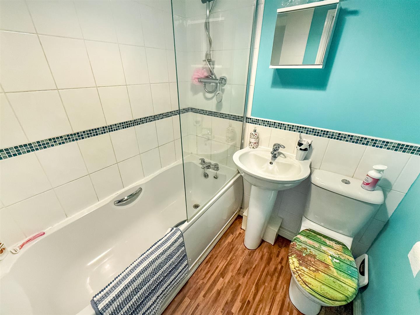 The bathroom has a panelled bath with mixer tap over, a glass screen and mains powered shower. There is a wash hand basin with mixer tap. w/c, vinyl floor, a heated towel radiator. part tiled walls, a shaver point and an extractor fan.