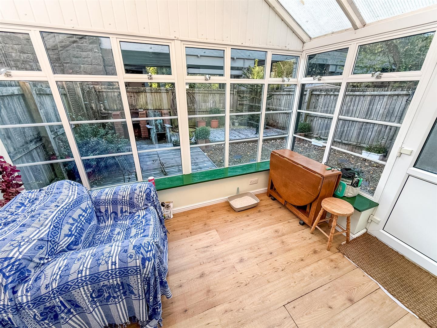 The bright conservatory has wood flooring and a part glazed door to the side leading out to the garden.