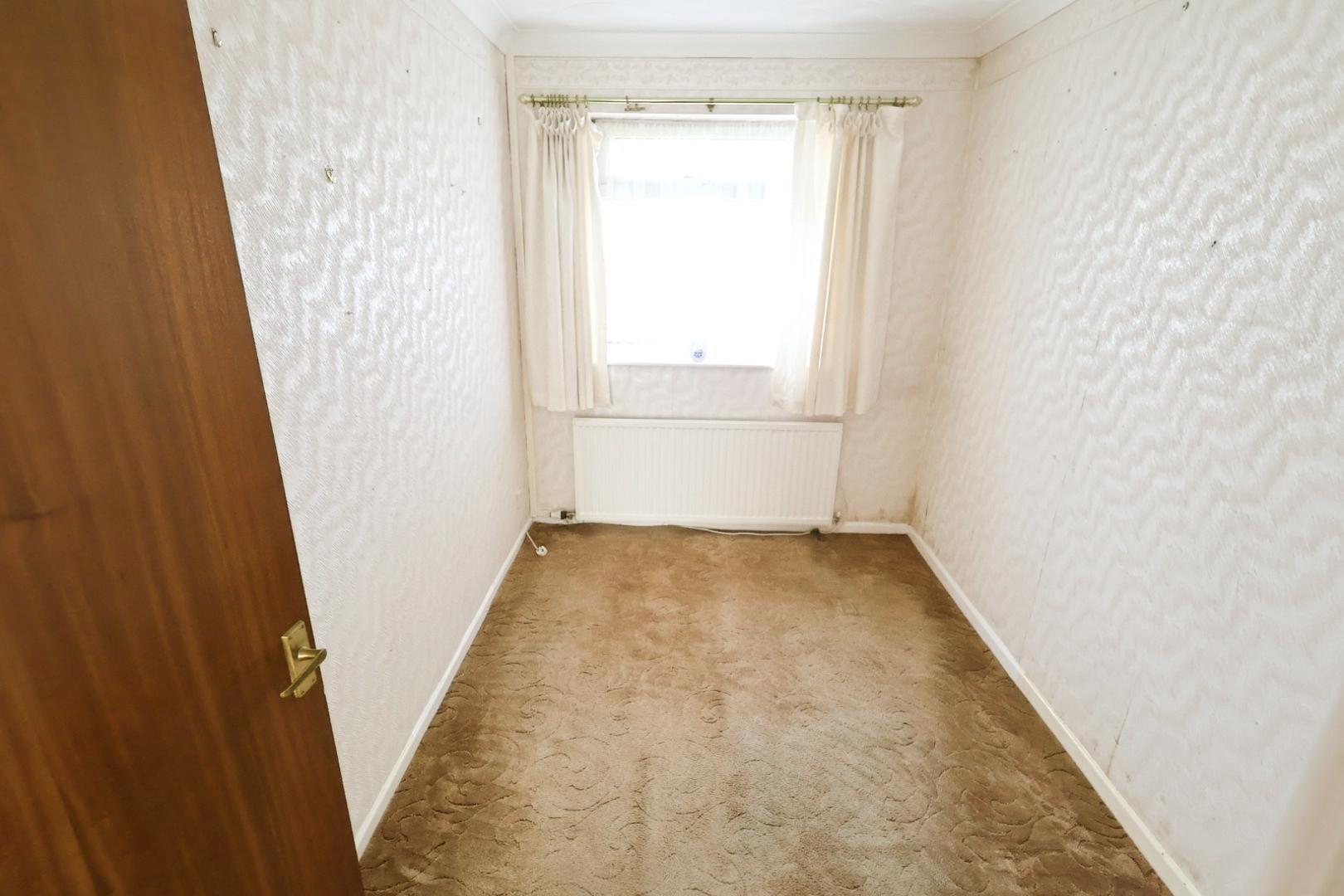 A well-proportioned bedroom with a window to the front elevation, radiator, fitted wardrobe with mirrored doors, and a large built-in airing cupboard offering excellent storage.