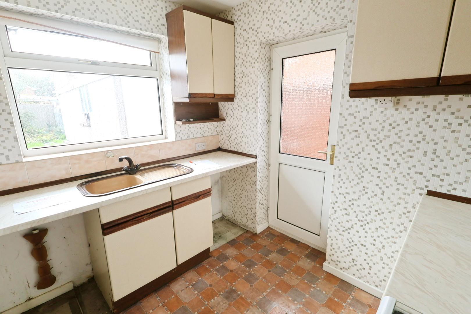 The fitted kitchen includes a range of wall, base and drawer units complemented by wood-effect work surfaces and a stainless-steel sink unit with mixer tap. There is space and plumbing for a washing machine and dishwasher, along with room for a slimline gas cooker and fridge/freezer. Tile-effect flooring and a door leading directly to the rear garden complete the space.