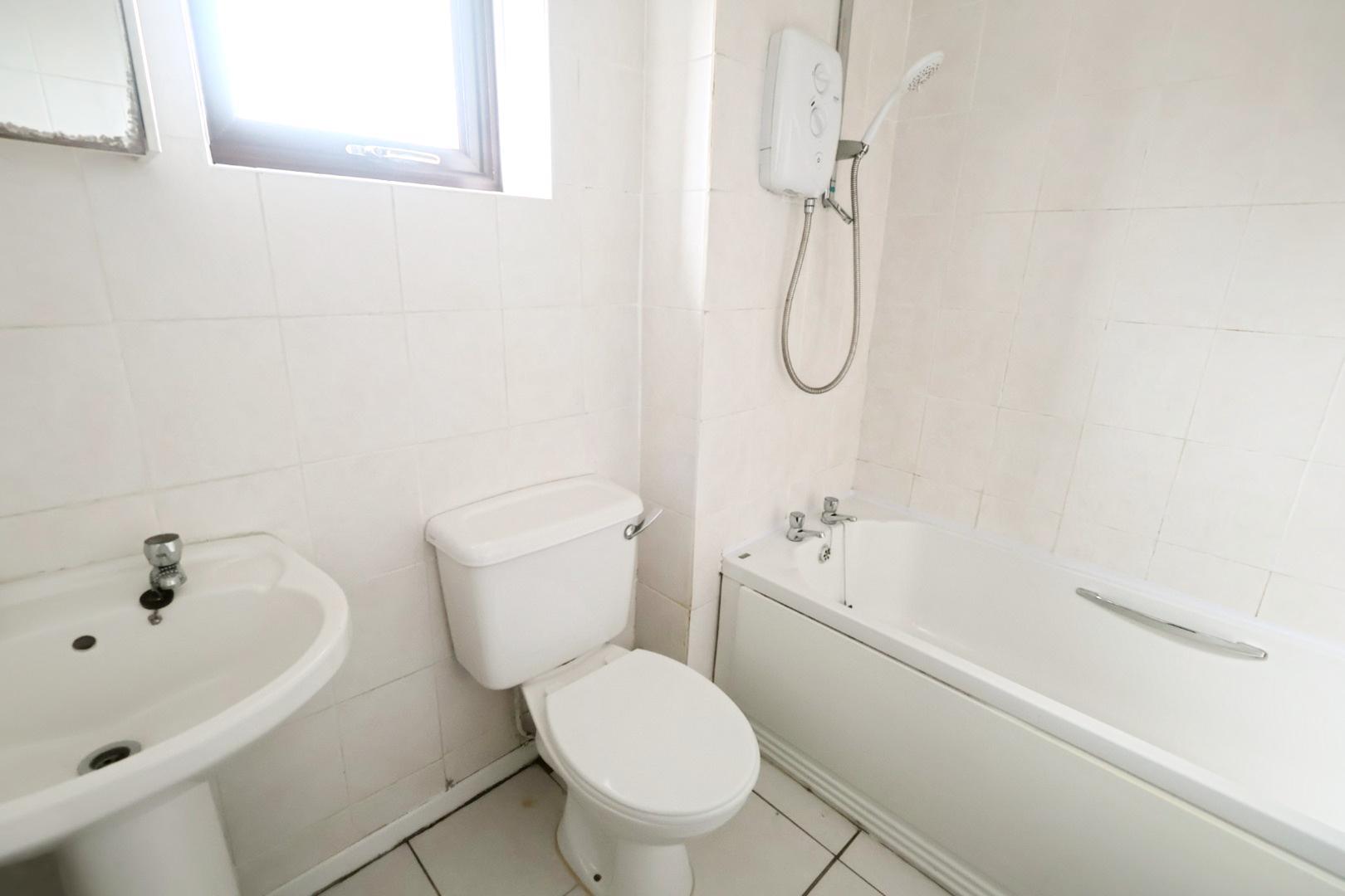 Fitted with a white three-piece suite comprising a panelled bath with electric shower over, a pedestal washbasin, and a low-level WC. The walls are fully tiled, and the floor is finished with ceramic tiles. There is also a radiator and an opaque window to the side elevation.