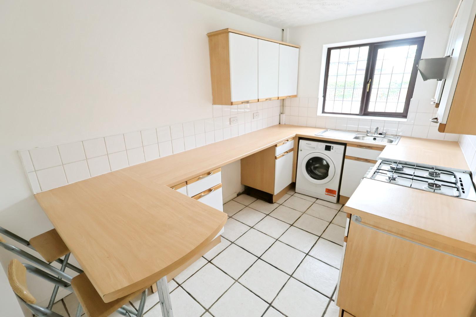 The kitchen is fitted with a range of wall, base, and drawer units, having ample work surface space, including a breakfast bar. It houses a stainless steel single drainer sink unit with a mixer tap and tiled splashback. There is space for a cooker with an extractor hood above, as well as space and plumbing for a washing machine. The floor is finished with ceramic tiles. A radiator is present, and a window faces the front elevation.