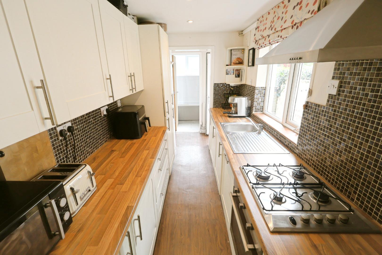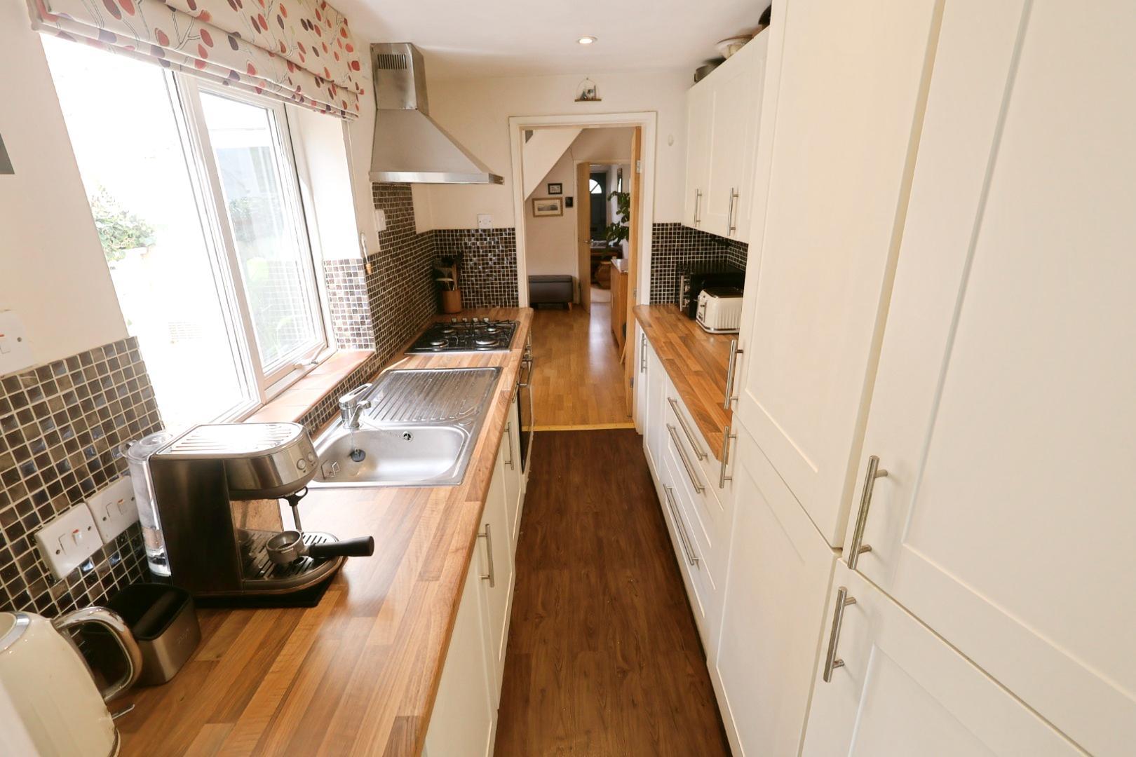Fitted with a range of cream shaker-style wall, base, and drawer units with stainless steel handles and wood grain effect work surfaces. Includes a stainless steel single drainer sink with mixer tap and tiled splashback. Integrated appliances include an oven, hob, extractor hood, washing machine, and fridge/freezer. A UPVC double-glazed window faces the side elevation, and an open throughway leads to the rear hall.