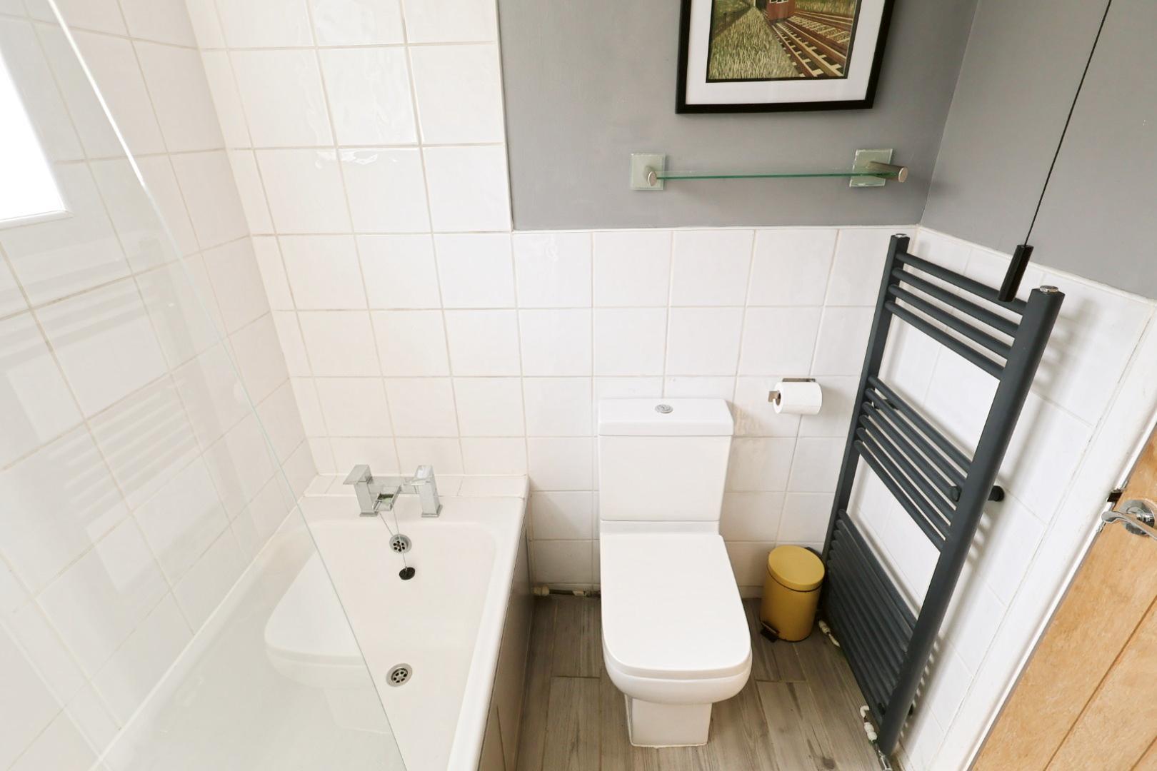 Fitted with a modern white suite comprising a panel bath with waterfall-style mixer tap, thermostatic shower with glass screen, low-level WC, and vanity unit with wash basin and waterfall tap. The floor is finished in wood-effect ceramic tiling, with partially tiled walls, an anthracite heated towel rail, extractor fan, and opaque rear window.