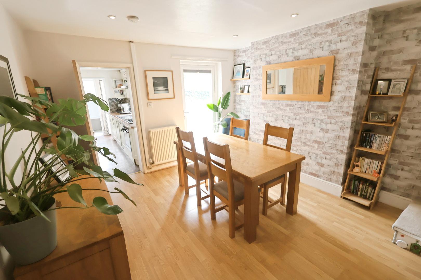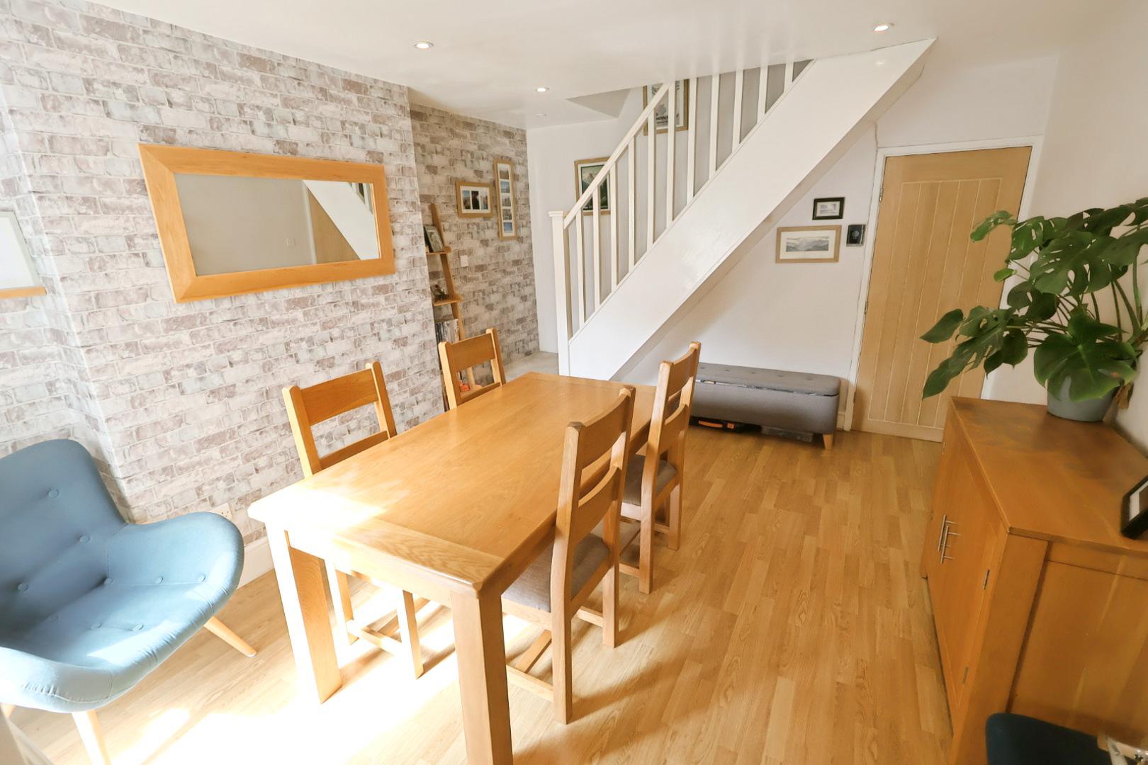 With wood grain effect laminate flooring, radiator, and recessed ceiling downlights. Stairs rise to the first floor, and a UPVC double-glazed door provides access to the rear garden. A light oak veneer door leads to the kitchen.