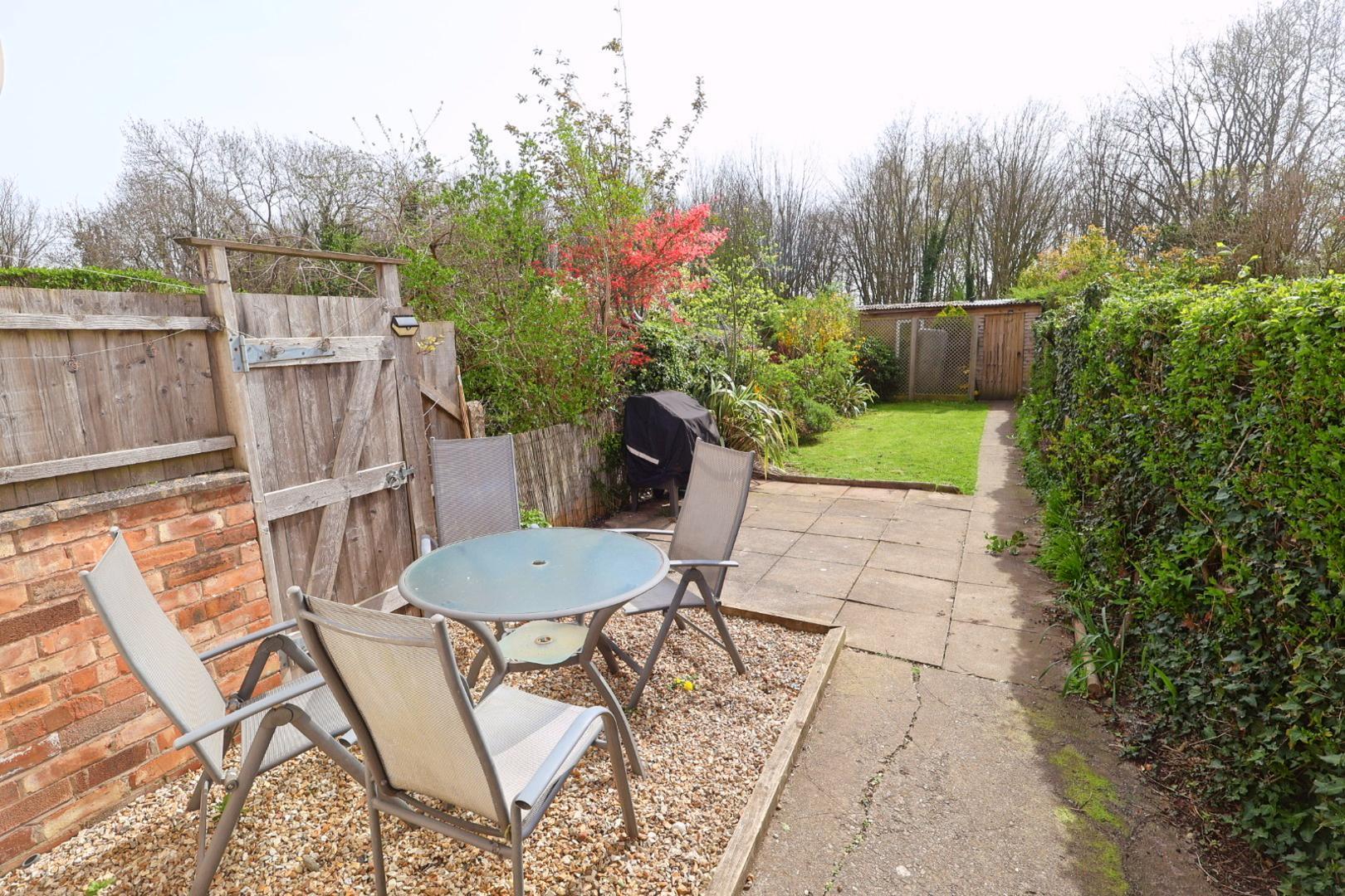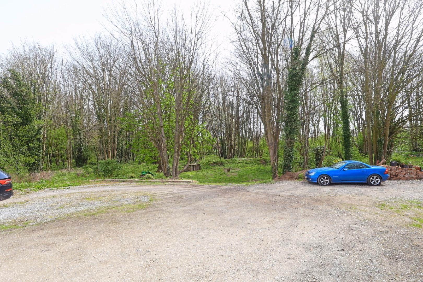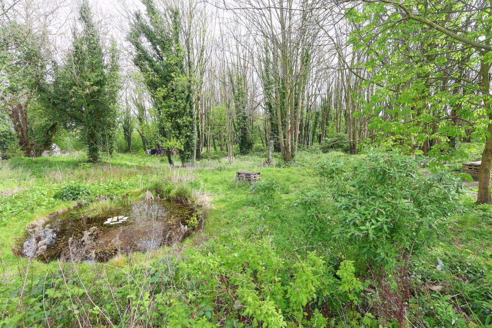A well-maintained garden featuring a gravel and paved patio area, lawn, and a variety of planted shrub borders. A paved pathway leads to a timber-covered storage area with a further gate providing access to the rear, where the current owner parks and accesses the single garage. Beyond this is a pleasant wooded area with a pond.
