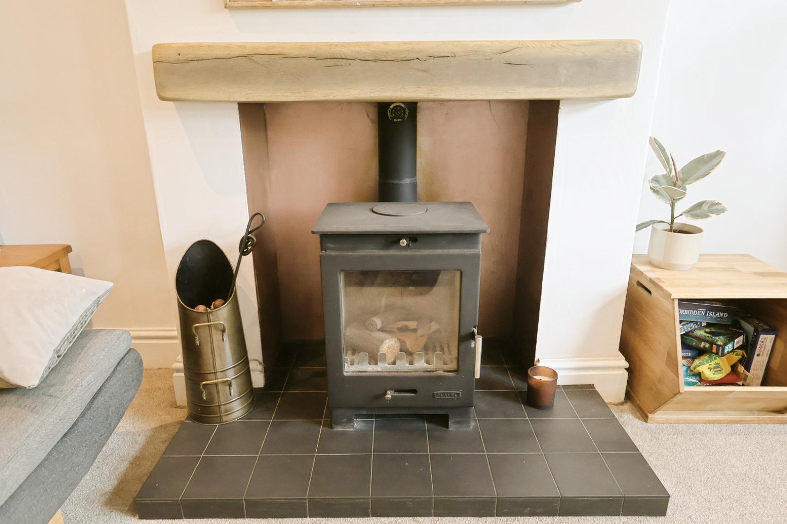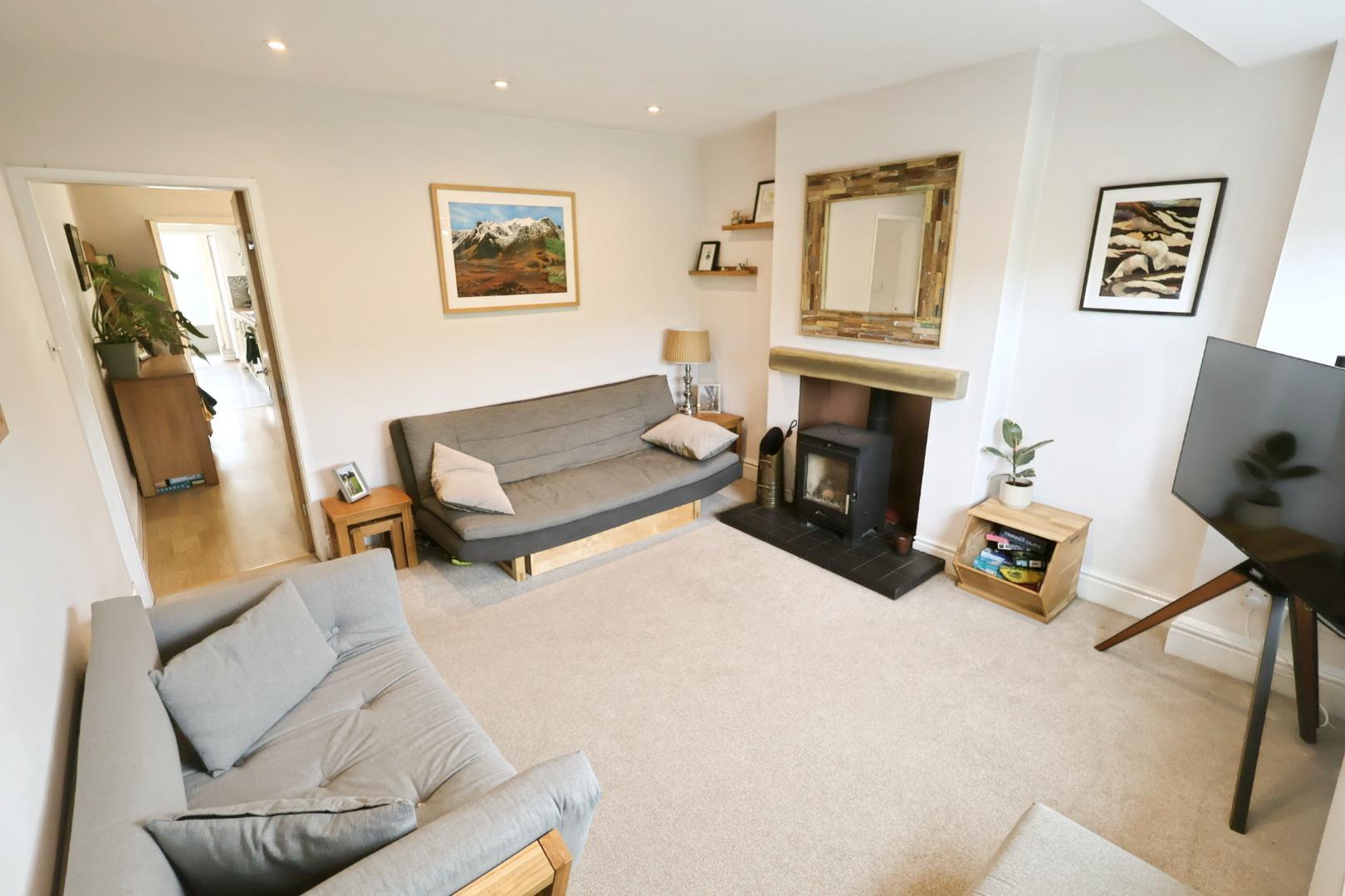 The property is entered via a composite opaque double-glazed front door, opening into the living room. This space features a UPVC double-glazed window to the front elevation with a radiator beneath, recessed ceiling downlights, and a cast-iron log burner set beneath a ceramic log-effect mantel on a black quarry tile hearth. A light oak veneer door leads through to the dining room.