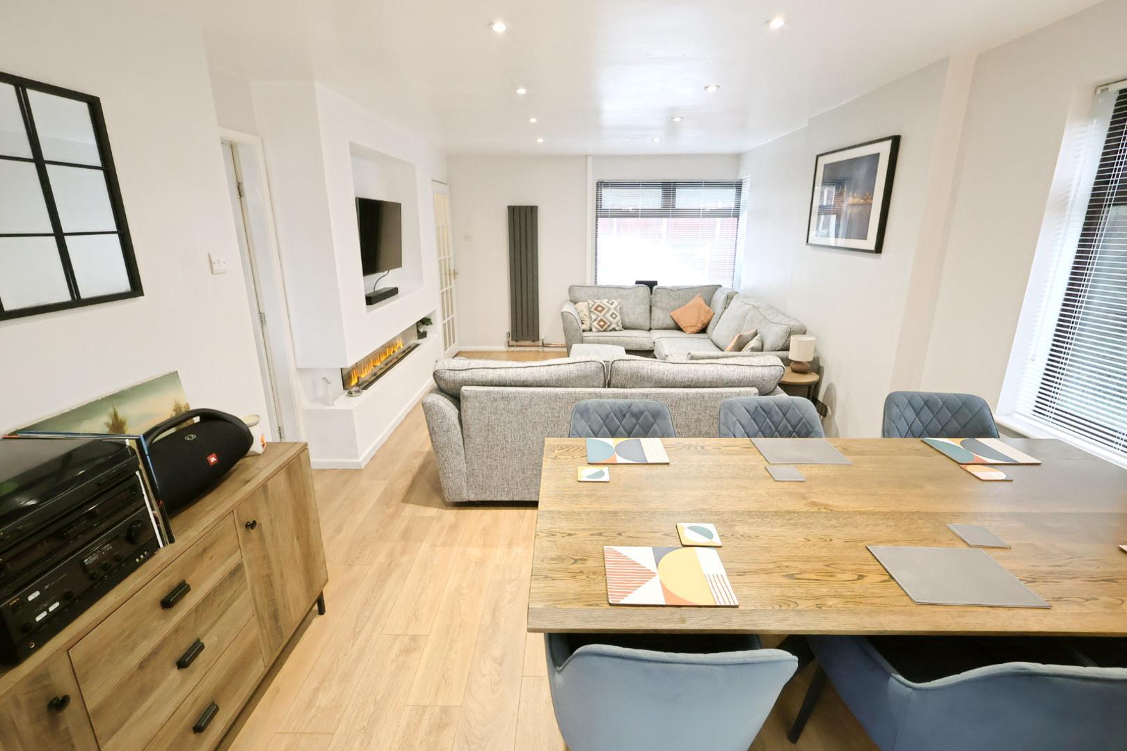 A spacious room with wood-grain-effect laminate flooring, windows to the front and side elevations, and two radiators. Recessed downlights are set within the ceiling. There are patio doors opening to the conservatory, a glazed door to the kitchen, and a media wall featuring an electric log-effect fire below.