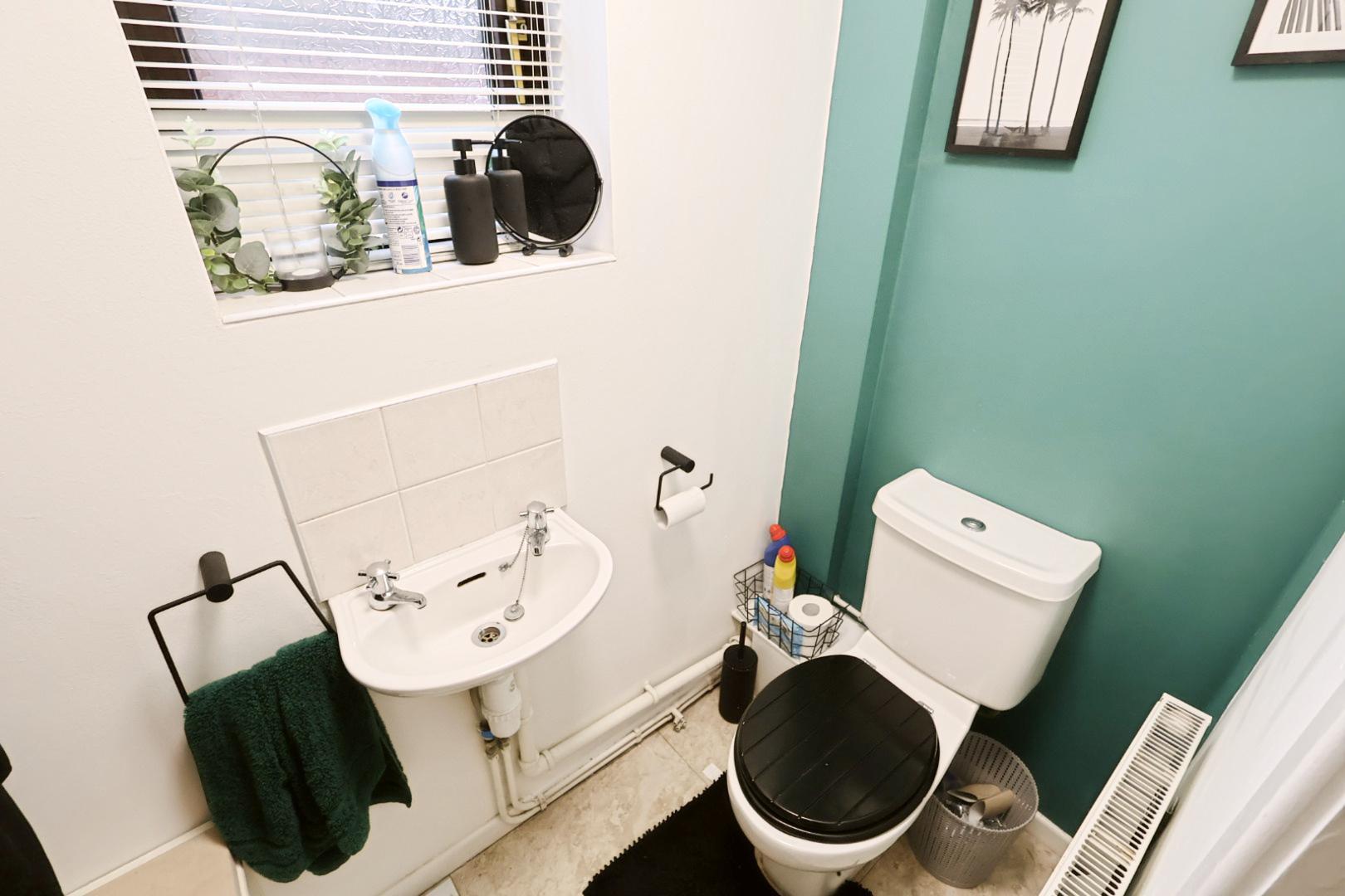 Installed with a dual-flush low-level WC and a wash hand basin with tiled splashback. There is no window to the front elevation. Radiator.