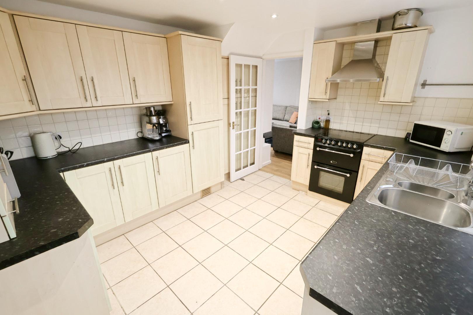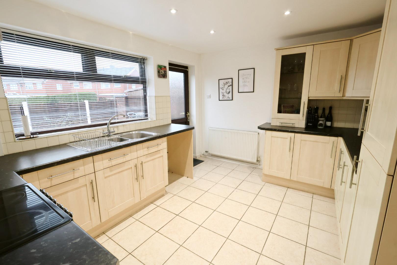Installed with a range of light wood-grain-effect wall, base, and drawer units, complemented by a display cabinet and stainless steel handles. The worksurface houses a stainless steel one-and-a-half bowl sink unit with mixer tap and tiled splashback. There is space for a cooker with a stainless steel extractor hood above, a fridge/freezer, and space and plumbing for a washing machine. The floor is ceramic tiled. Recessed downlights are set within the ceiling. Radiator, window to the rear elevation, and an opaque uPVC double-glazed back door.