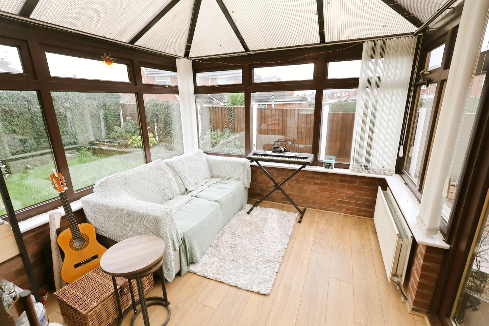With a continuation of the wood-grain laminate flooring, the conservatory is constructed on a low brick wall with a uPVC double-glazed frame, integrated French doors, and a radiator.