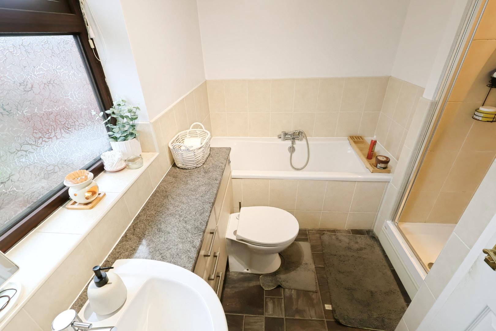 Installed with a white four-piece suite comprising a tiled panel bath with central mixer tap and handheld shower attachment, a separate shower enclosure with electric shower, a vanity unit housing a wash hand basin with mixer tap, and a dual-flush low-level WC. Walls are partially tiled. Chrome heated towel rail, opaque window to the rear elevation, and a combination extractor fan and light set within the ceiling.