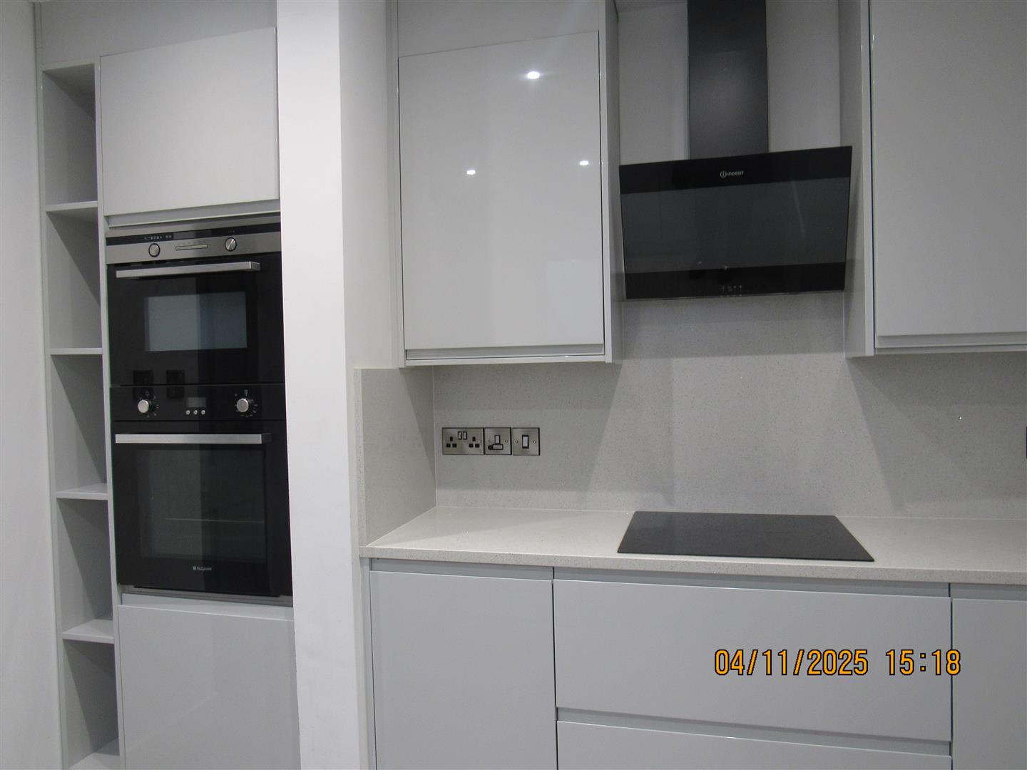 With full tiled walls, convector heater over rear door, base and wall units with integrated hob, oven and grill, single stainless steel sink drainer unit, windows to the rear and side.