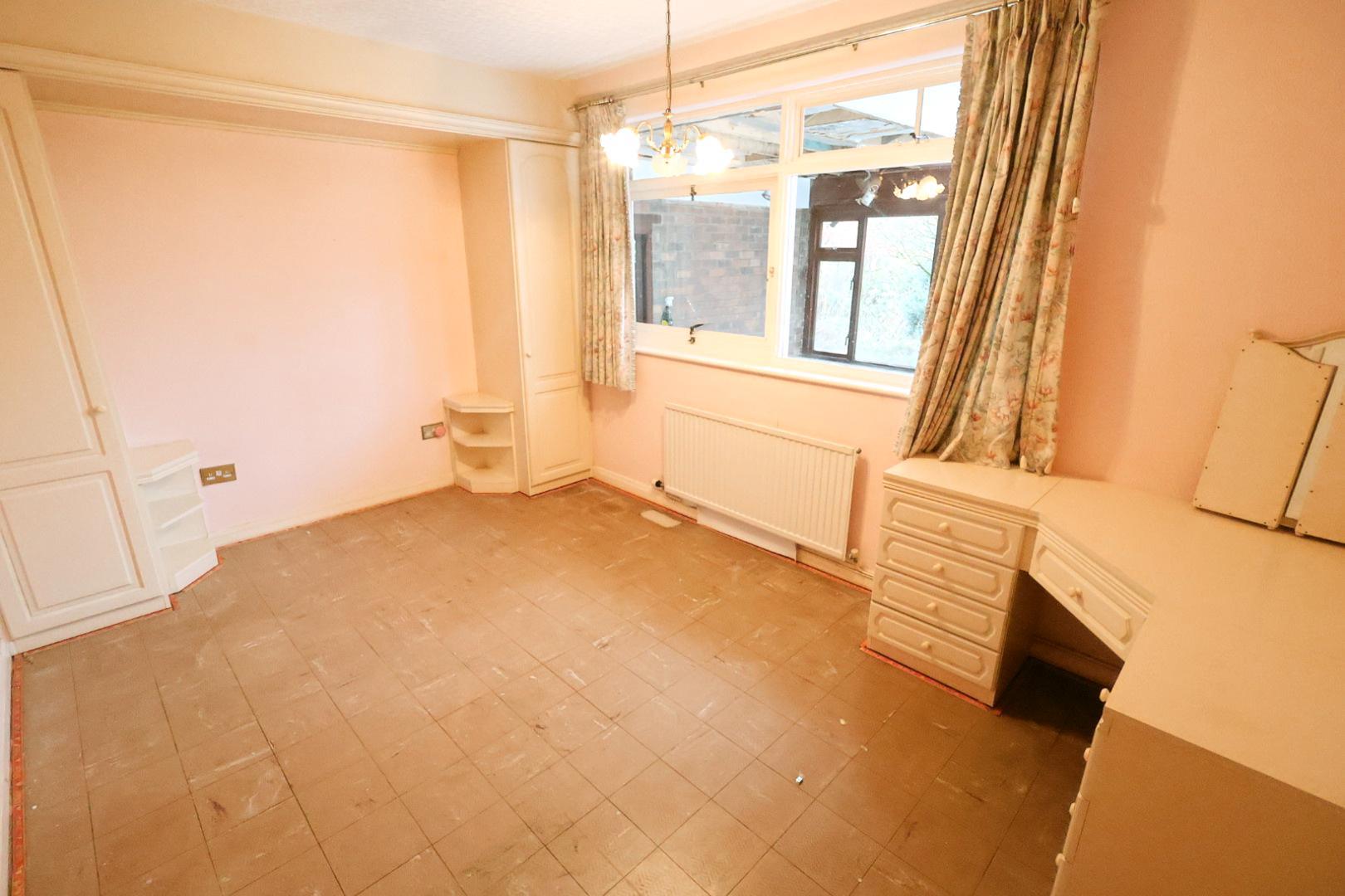 Window overlooking the garden room with radiator below. Built-in double wardrobe with luggage cupboard above, fitted wardrobes, corner units, and dressing table.