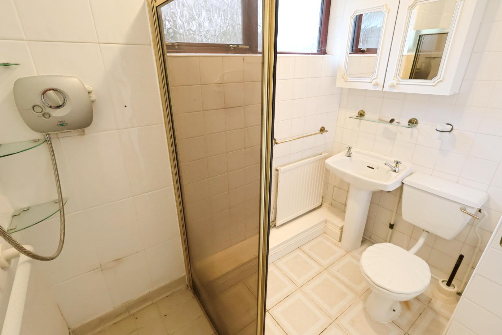 Oversized shower enclosure with electric shower, low-level WC, pedestal wash hand basin, tiled walls, radiator, and high-level opaque double glazed window to the front elevation.
