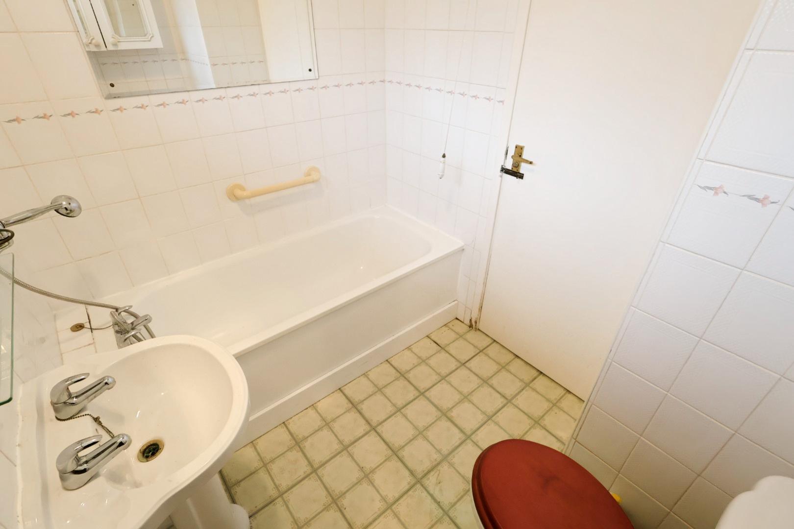 Panelled bath with mixer tap and handheld shower attachment, pedestal wash hand basin, low-level WC, fully tiled walls, radiator, and high-level opaque double glazed window to the front elevation.