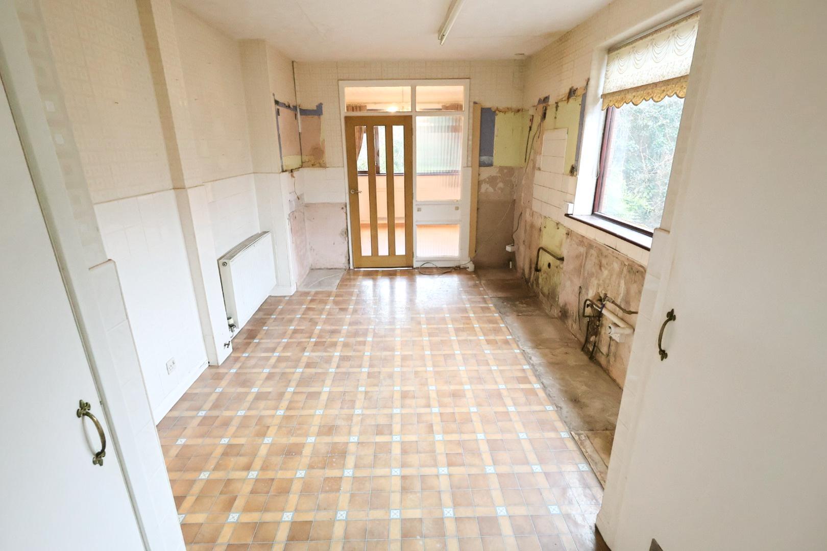 Continuation of the living room flooring, radiator, and double glazed window to the rear elevation. Light oak glazed door opening into the kitchen.