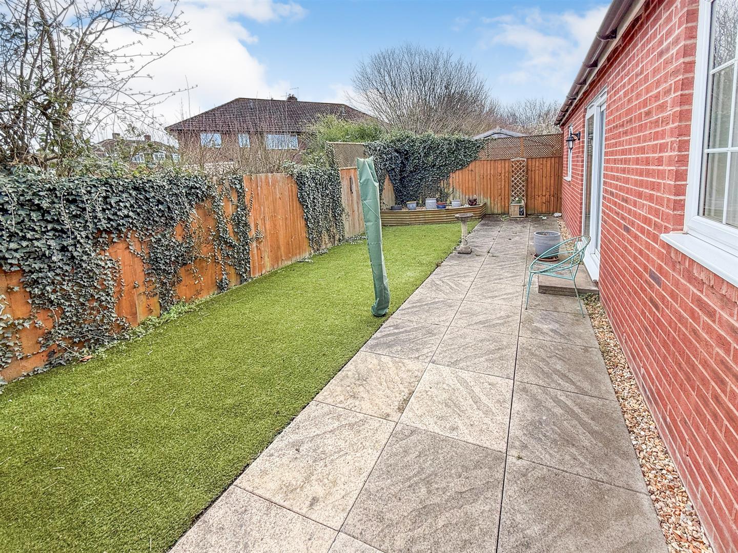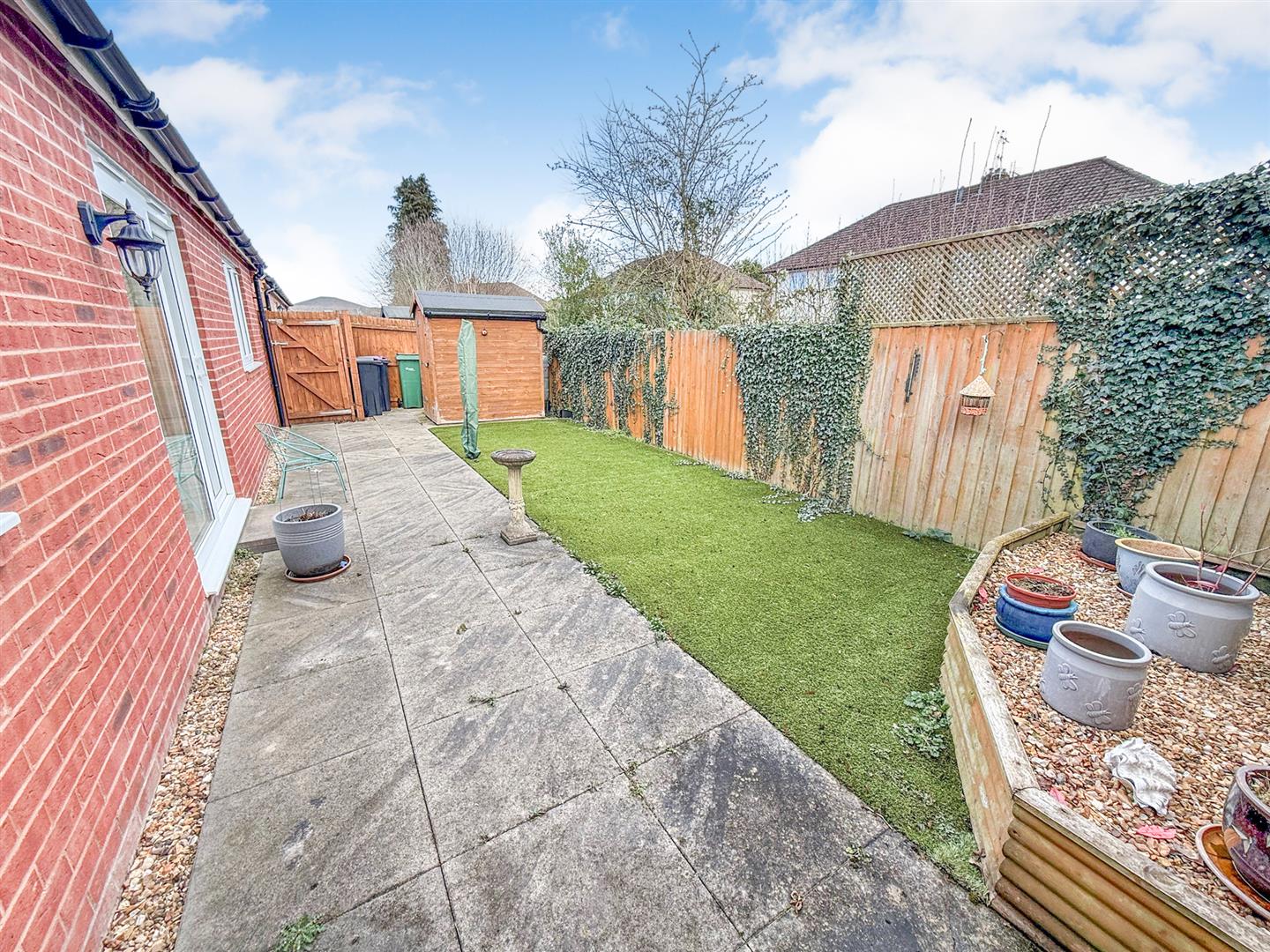 The rear of the property is mainly laid to artificial lawn with a patio area and fully enclosed by panel fencing. There is a garden shed and storage area behind with gated access to the front of the property.