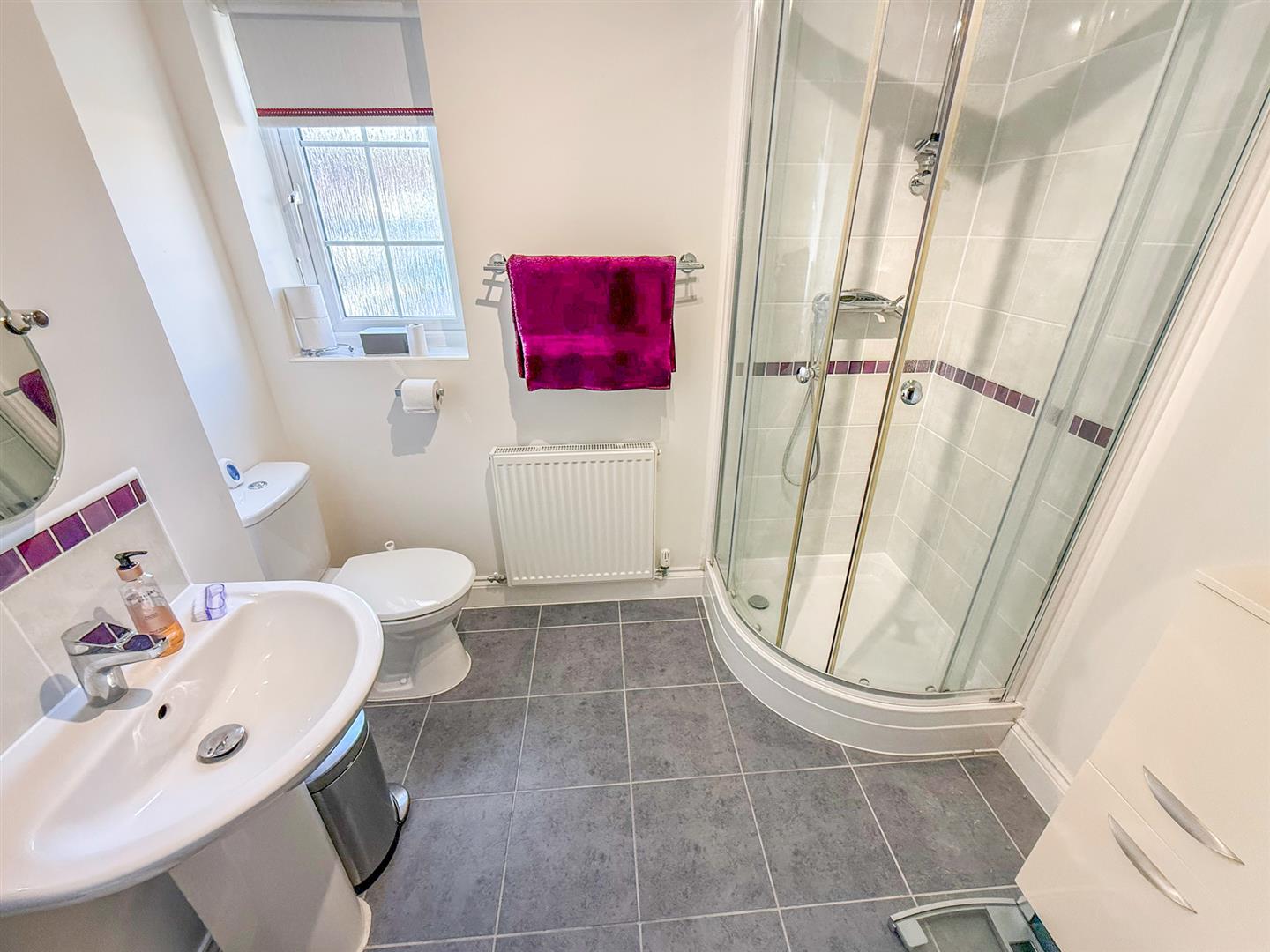 The shower room comprises a corner shower cubicle with mains shower, wash hand basin with mixer tap over and WC. Extractor fan, a window to the front and shaver point.