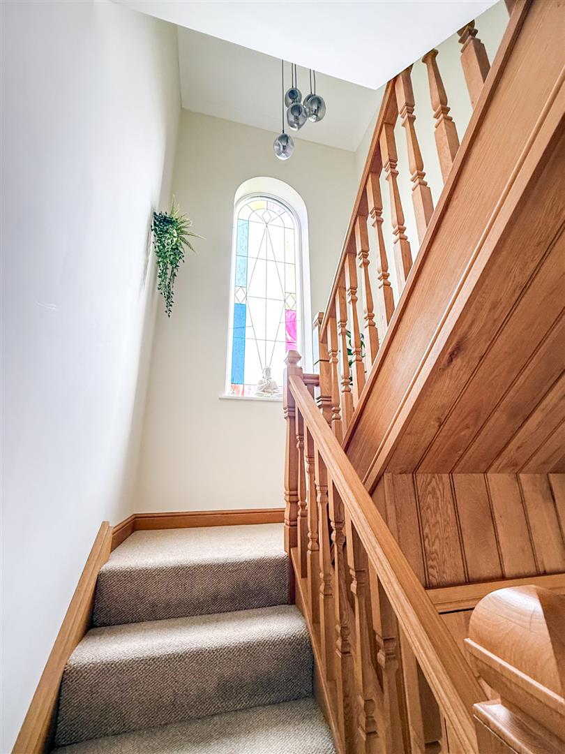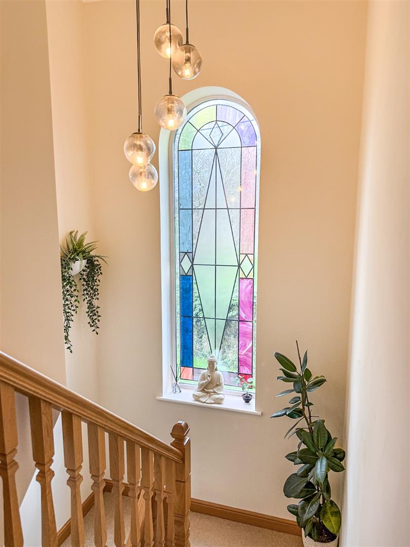 The staircase is flooded with light having a stunning full length arched window with stained glass.