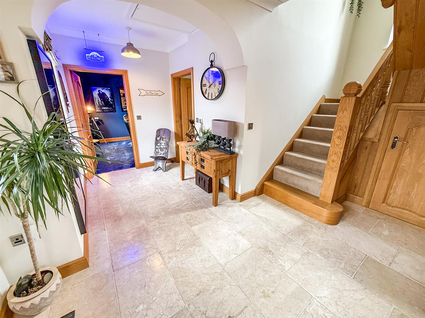 The spacious, bright hallway has a window to the front aspect and a part glazed door letting in lots of light, ceramic tiled flooring with underfloor heating and door to a storage cupboard housing the under floor heating manifold and has the fibre broadband that runs directly into the home . There is access to the loft via folding ladder which is partially boarded with light laid on. The feature oak staircase leads you to the first floor landing. Doors lead to the shower room, cinema room, lounge and the kitchen.