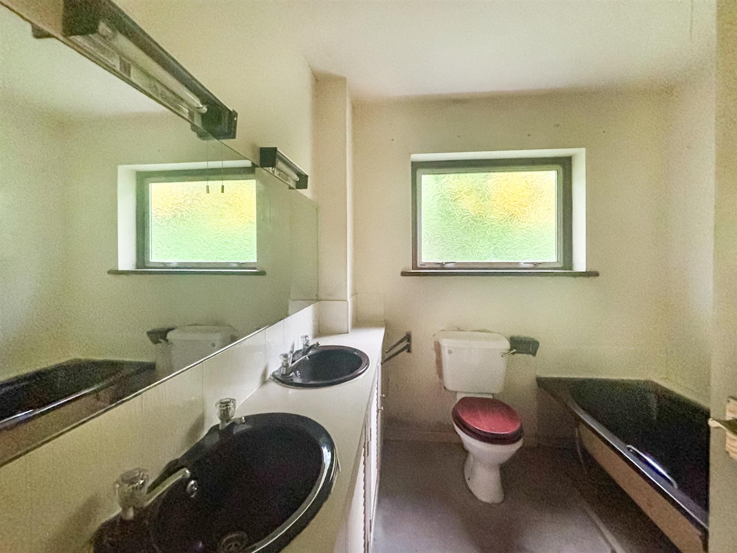 The bathroom has a panelled bath, a window to the side, low level w.c., radiator and double sinks on a vanity unit.