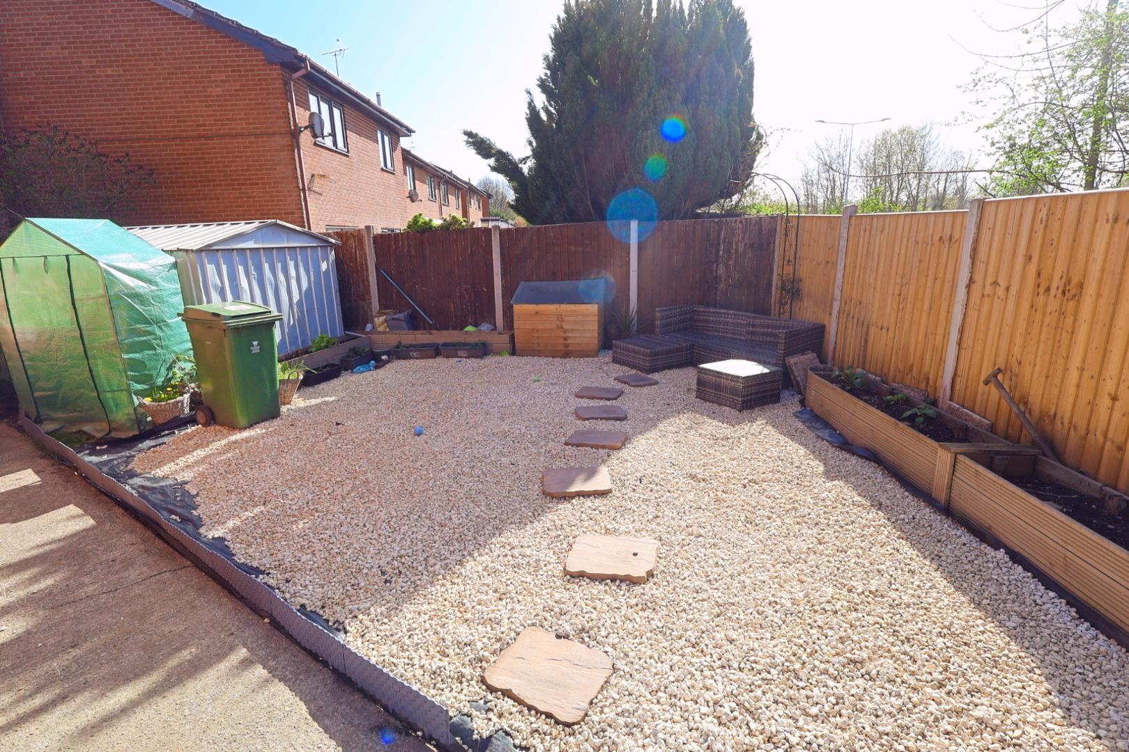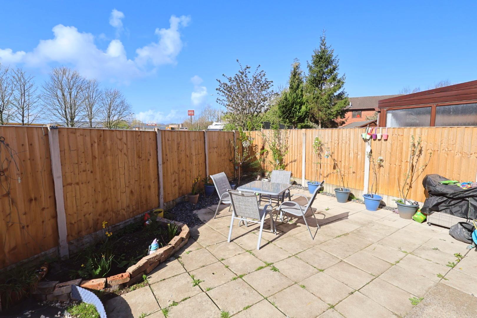 The rear garden is predominantly paved, with slate chip borders and a flower bed, all enclosed by timber fencing. The garden benefits from a sunny orientation and includes an external water supply.