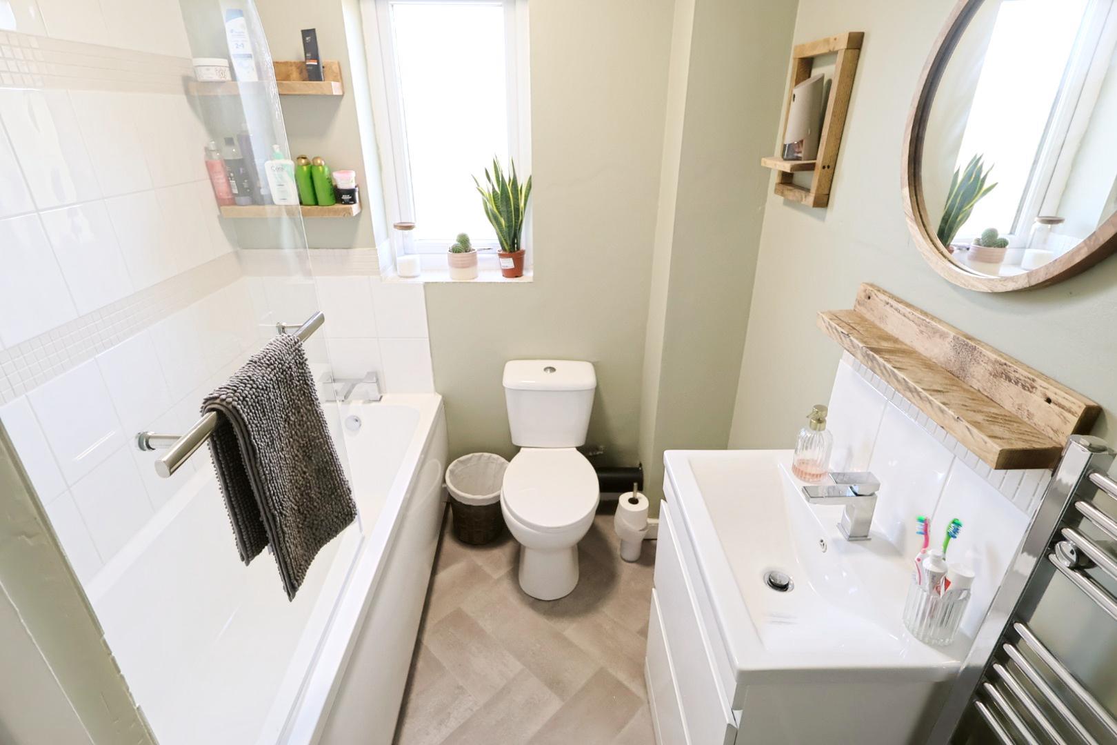 Fitted with a modern white three-piece suite comprising a panelled bath with mixer tap and electric shower over with protective screen, a dual flush low-level WC, and a vanity unit with wash hand basin and mixer tap.