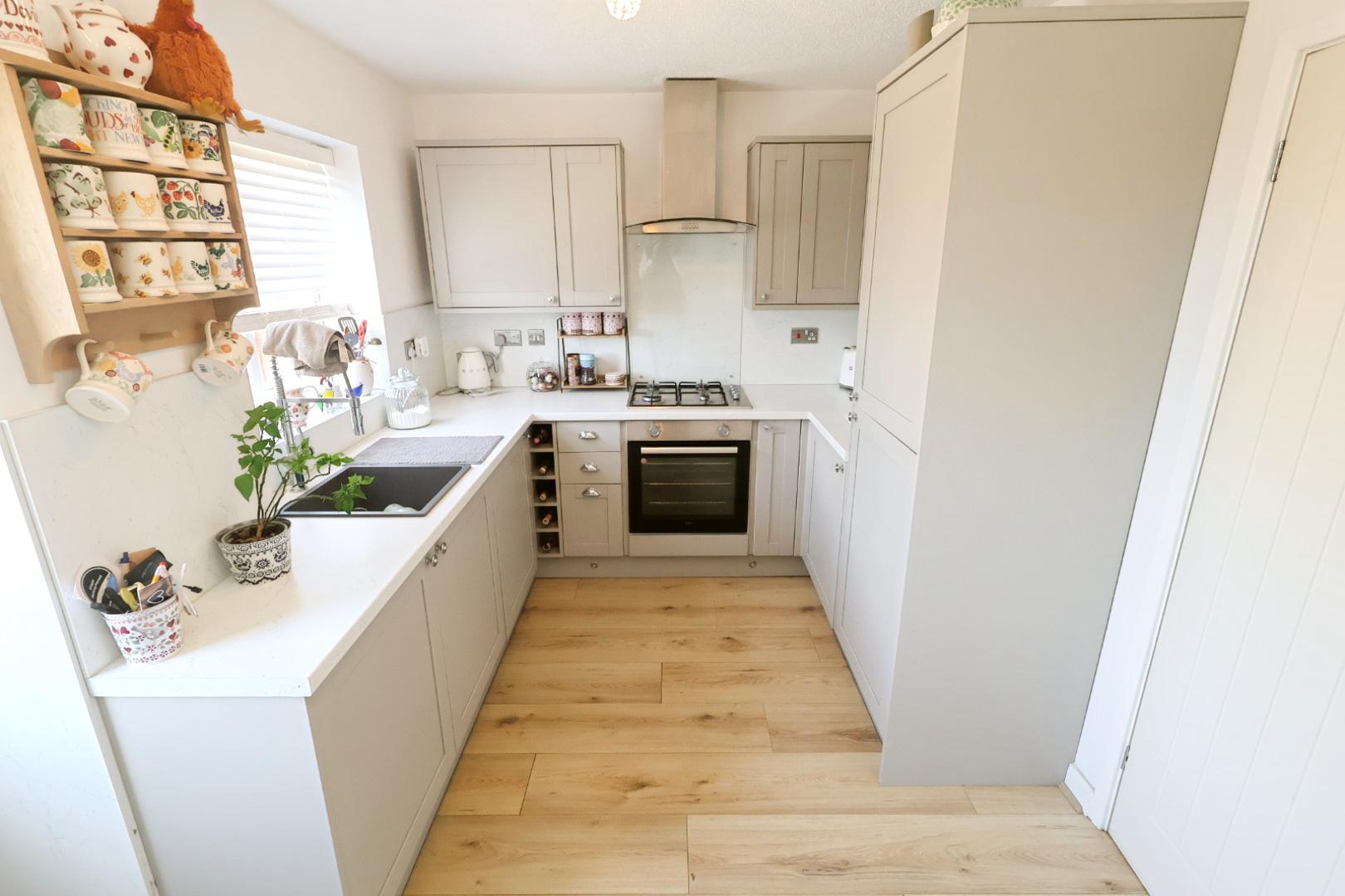 An attractive, recently fitted kitchen comprising a range of shaker-style wall, base, and drawer units with complementary work surfaces. Incorporates a resin single bowl sink unit with mixer tap.