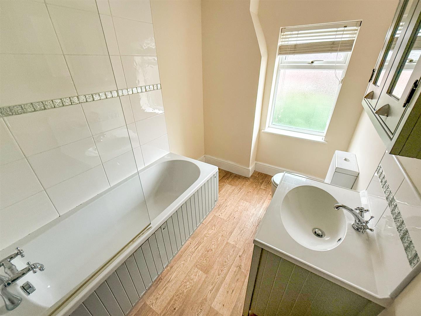 The modern family bathroom is fitted with a panel bath with a mixer tap, electric shower over and glass screen, low level w.c., wash hand basin on a vanity unit with a mixer tap over, part tiled walls, wood flooring, heated towel rail, vanity cabinet and a window to the rear.