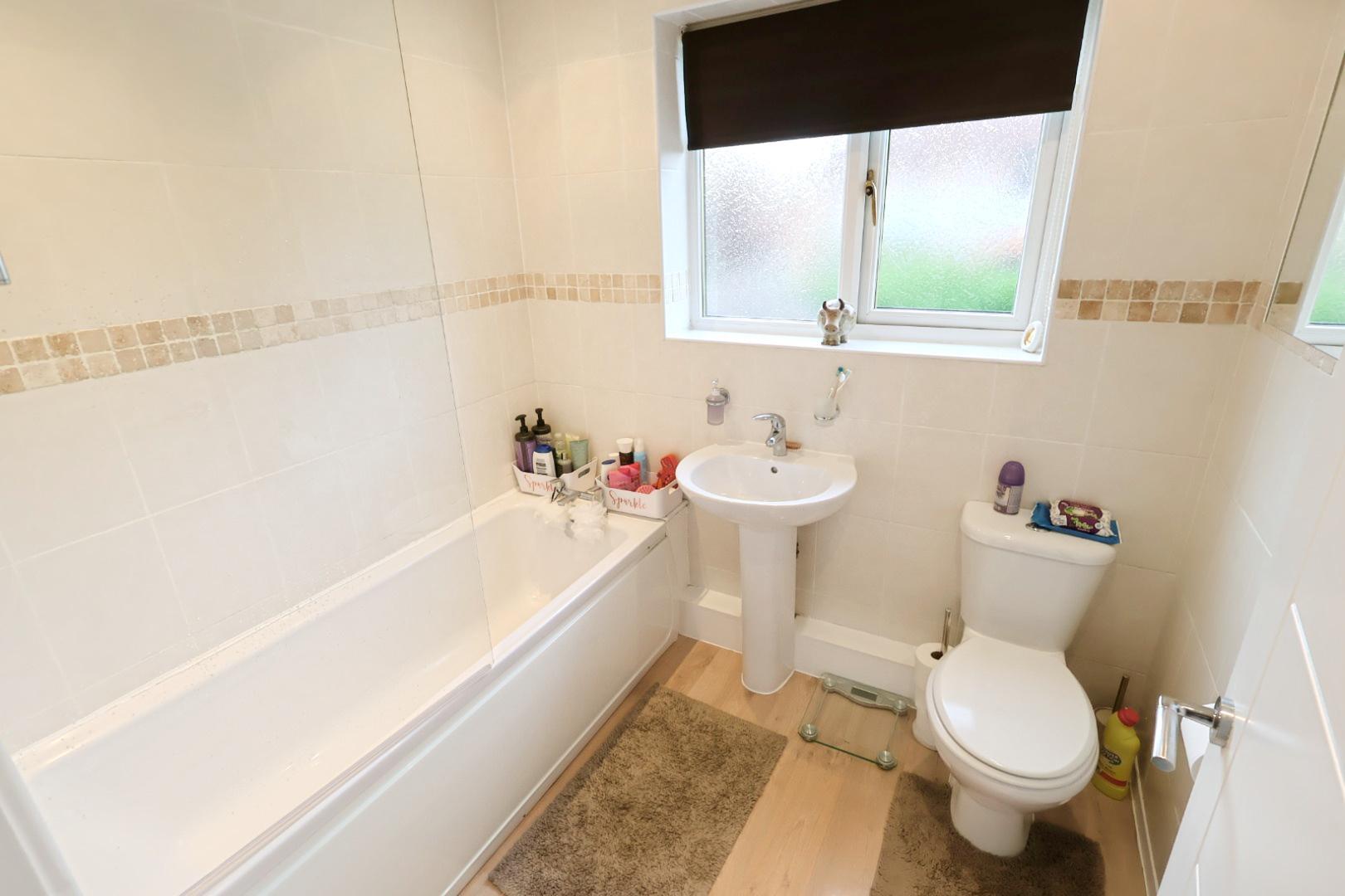 Installed with a white three-piece suite comprising a panelled bath, low-level WC, and pedestal wash hand basin. The room features woodgrain effect laminate flooring, fully tiled walls, a chrome heated towel rail, and an opaque window facing the rear elevation. Recessed downlights and an extractor fan are set within the ceiling.