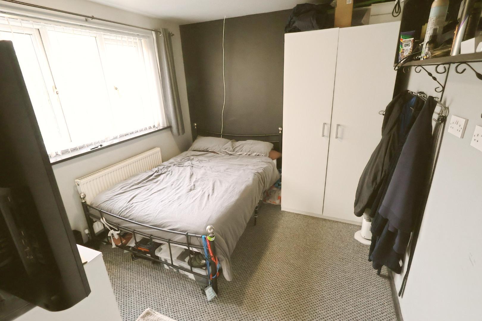 Features a built-in floor-to-ceiling double wardrobe with sliding doors, and a window facing the front elevation with a radiator below.