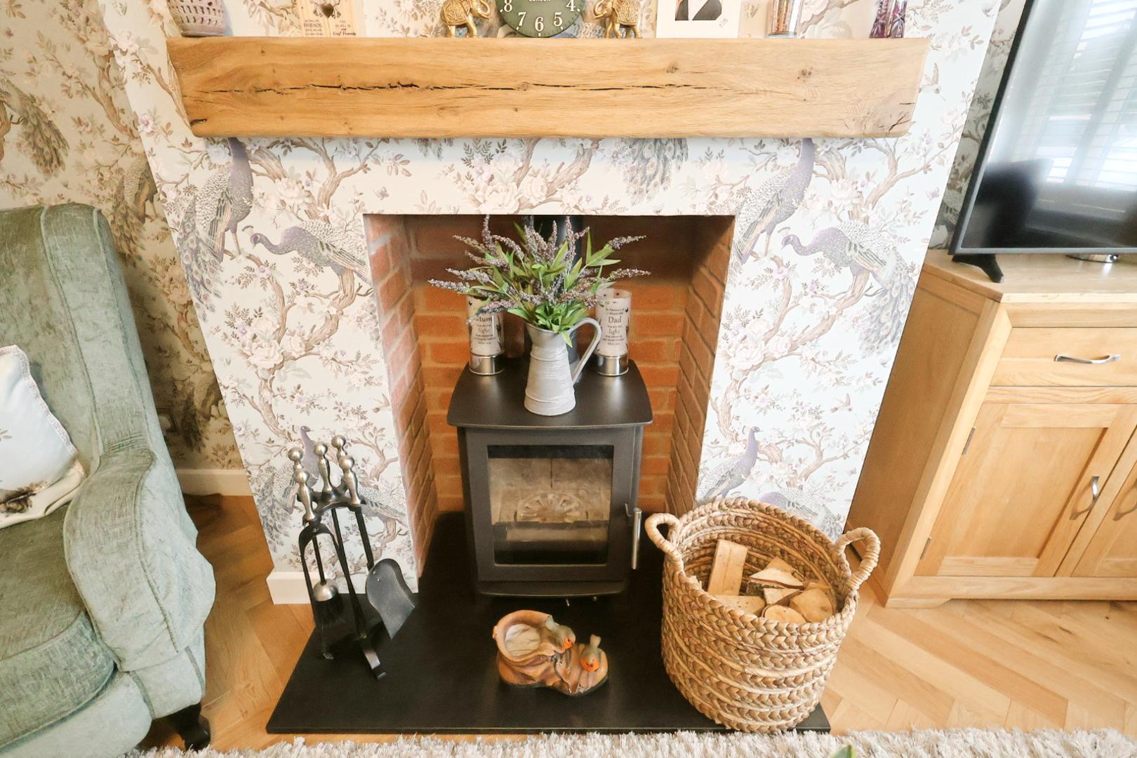 Featuring wood block flooring laid in a herringbone pattern, the living room has a bay window facing the front elevation, with integrated plantation shutters and a radiator below. A central granite hearth and fireplace house a log burner beneath a light oak mantle beam. An open throughway leads to the dining room.