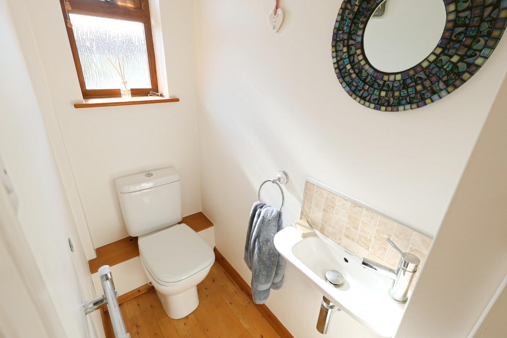 Also with light oak-style flooring, this room is fitted with a white dual-flush low-level WC and a wash hand basin with tiled splashback. There is a chrome heated towel rail, an opaque window to the front elevation, and a Glow-worm wall-mounted gas combi boiler with a meter cupboard below.