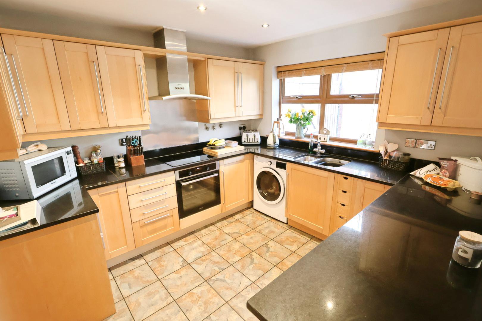 The kitchen is fitted with a range of light wood-grain effect wall, base and drawer units complemented by stainless steel handles and granite work surfaces. These incorporate a stainless steel one-and-a-half bowl sink unit with mixer tap. Integrated appliances include a stainless-steel oven, electric hob and stainless-steel extractor. There is space and plumbing for a washing machine and dishwasher, as well as space for a fridge. Having a ceramic tiled floor, a window faces the rear elevation, recessed downlights are set within the ceiling, and an open archway leads through to the dining room.
