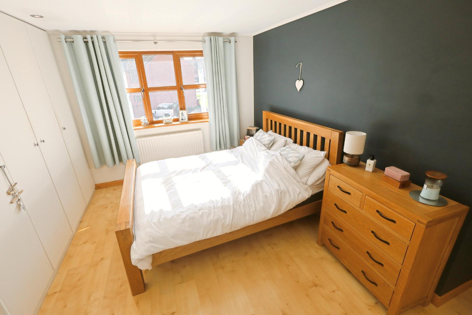 With a window to the front elevation and radiator below. The room features light wood-grain effect laminate flooring, a fitted double wardrobe and additional wardrobes running along the length of one wall. A glazed door opens to the ensuite wet room.