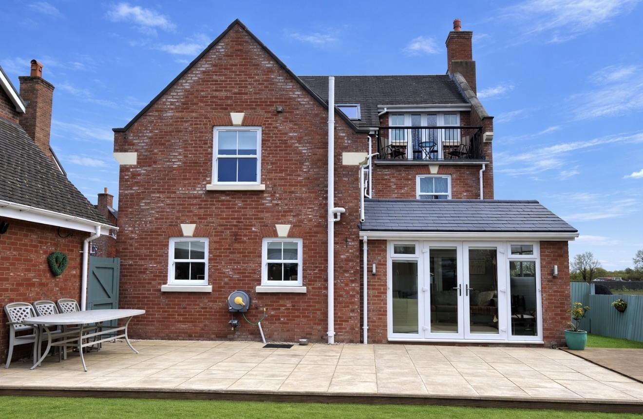 The rear garden is laid for low maintenance with a large paved patio and adjoining decked sun terrace, perfect for alfresco entertaining. A generous area of artificial grass provides additional outdoor space. Enclosed by wooden fencing and hedging, the garden is bordered by open countryside with uninterrupted views across adjoining fields.