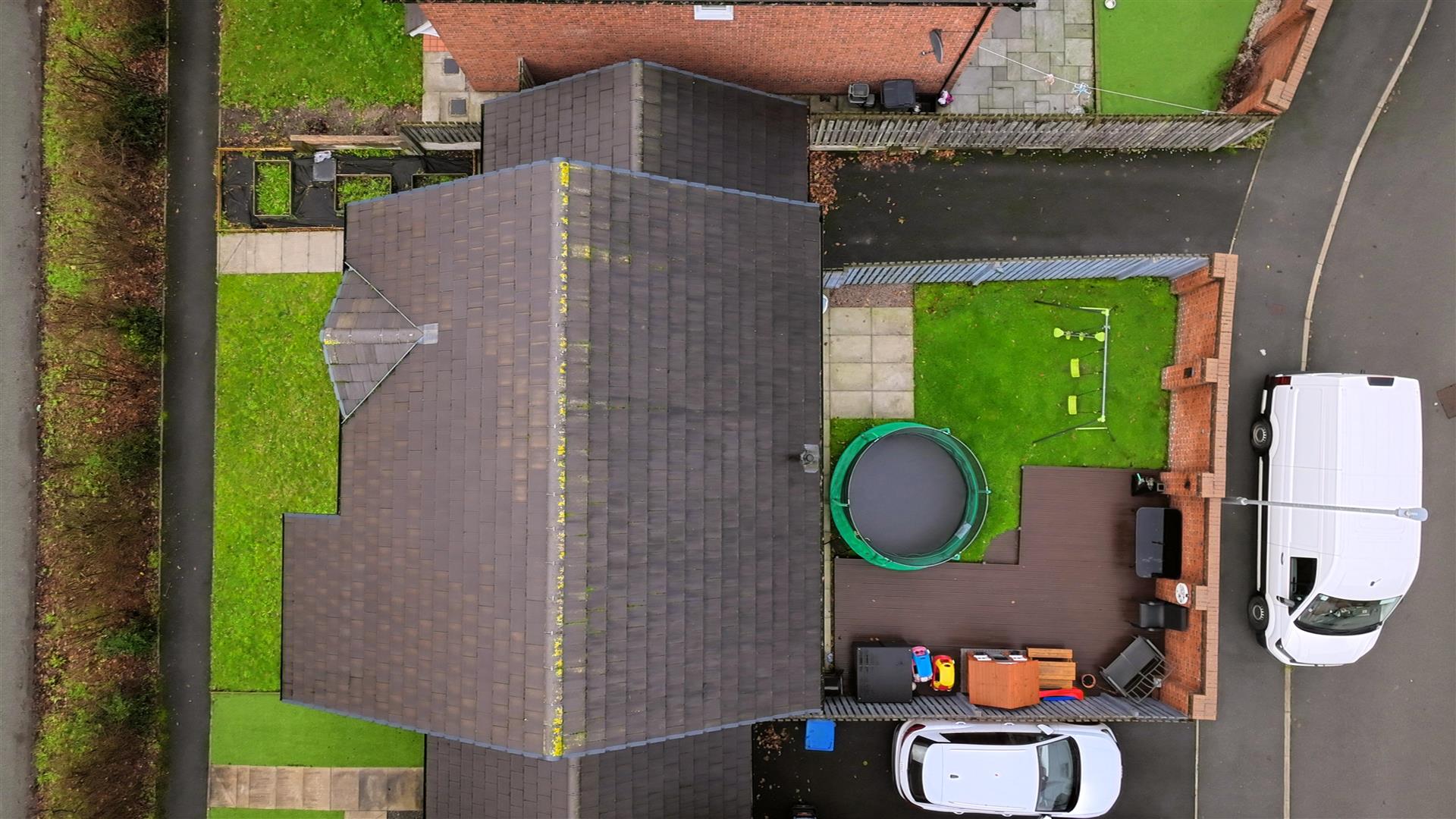 To the front of the property is a lawned garden with a paved pathway leading to the rear garage access, where there is an external light. The pathway also leads to the main entrance door, set within a quarry-tiled storm porch with a courtesy light. There is also an external water supply. The rear garden includes a driveway leading to the garage and a timber gate opening into an enclosed garden. The garden is mainly laid to lawn with a paved pathway, patio area, and a raised L-shaped decked seating area. It is enclosed by a combination of wooden fencing and a brick rear boundary wall.