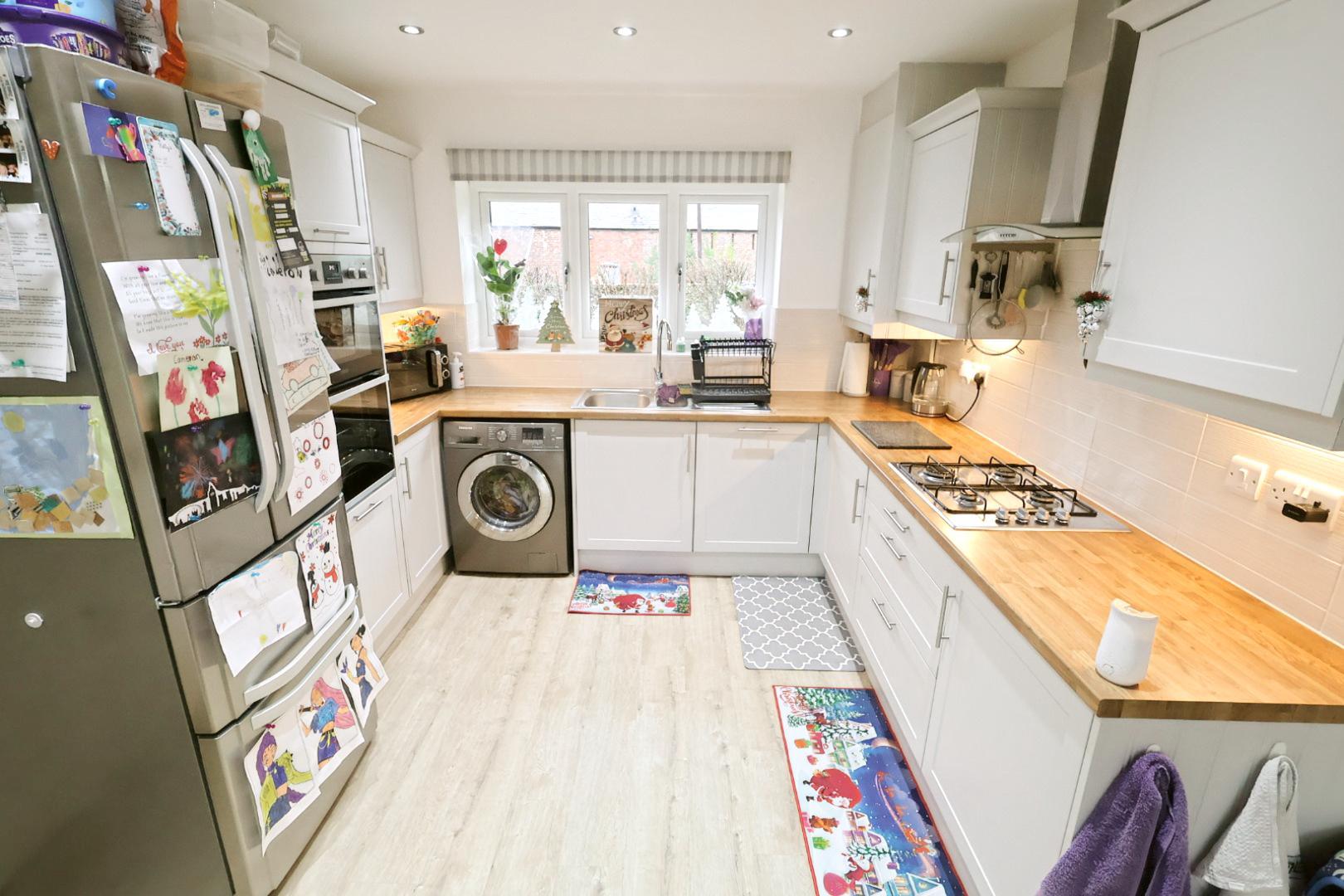 Laid with wood-grain effect flooring throughout and fitted with two radiators. There is a window to the front elevation, and UPVC double-glazed French doors open into the rear garden. A further door leads into the garage. The kitchen area is fitted with a range of modern Shaker-style wall, base, and drawer units with stainless steel handles and wood-grain effect work surfaces. These house a stainless-steel one-and-a-half bowl sink with mixer tap and tiled splashback. Integrated appliances include a stainless-steel double oven, hob, extractor hood, and a dishwasher. A cupboard houses the gas combination boiler, and recessed downlights are set within the ceiling.