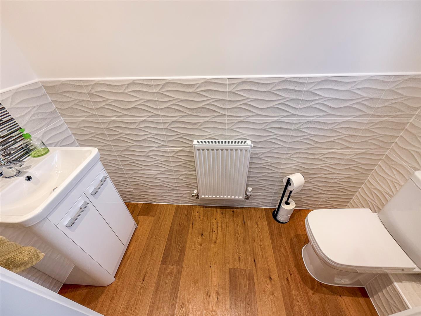 The cloakroom has a w/c, a wash hand basin on vanity unit, wood floor and a radiator. There is a window to the side, spot lights, beautiful part tiled walls and an extractor fan.