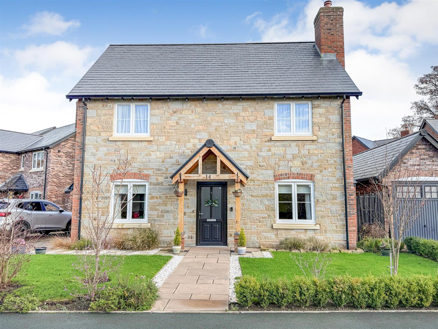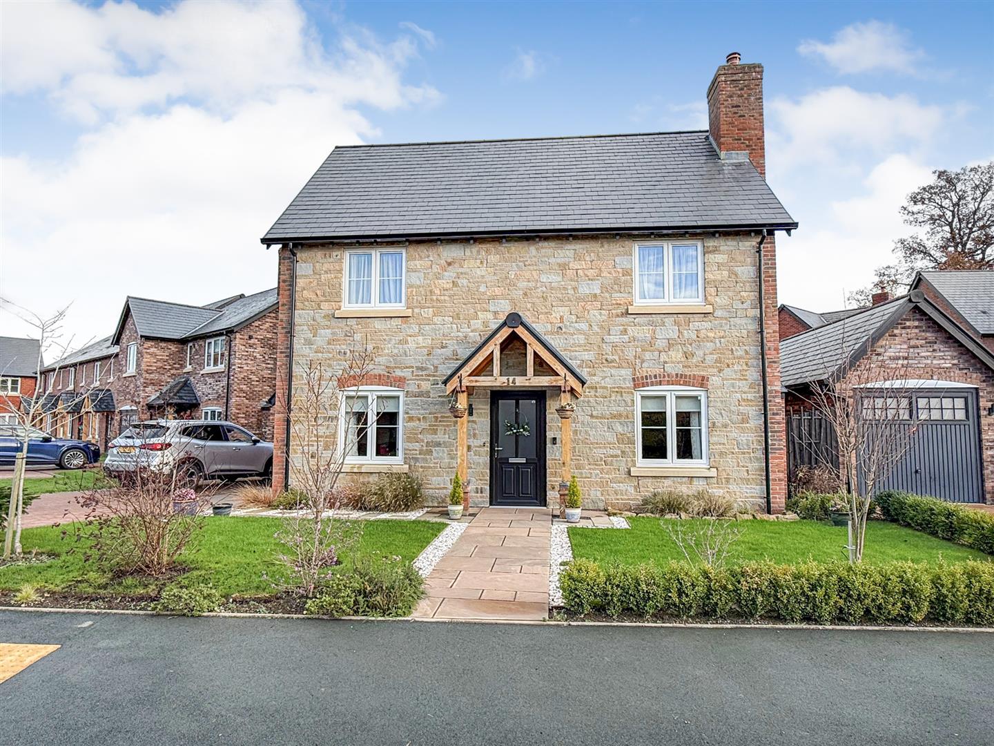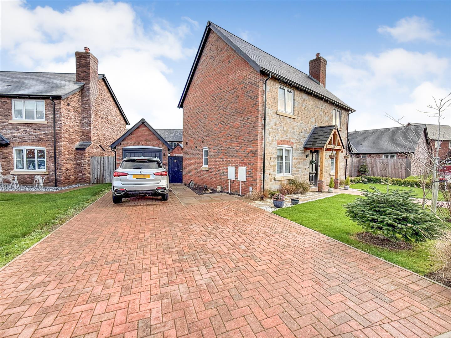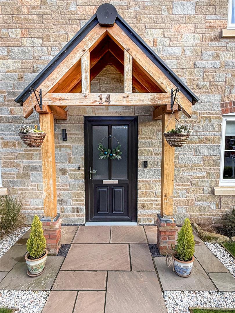 To the front of the property is an Indian stone path leading to the front door and oak porchway with lawn and shrubbed areas on each side of the path. A block paved driveway to the side of the property provides parking space for several vehicles leading to the garage.