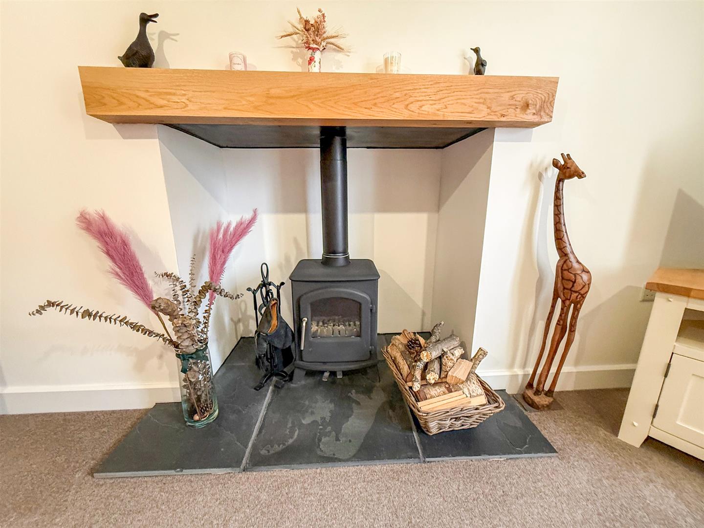 The good sized, bright lounge has a window to the front, a radiator, inset wood burning stove with a slate hearth and oak beam over.