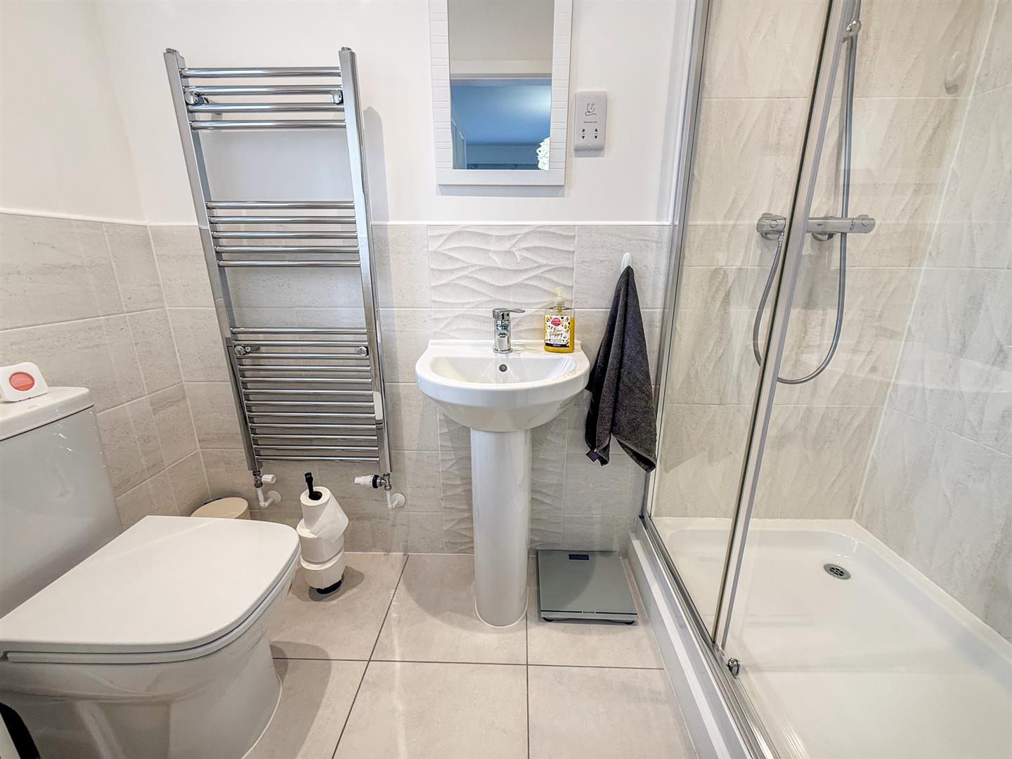 The modern ensuite has a double shower cubicle, w/c, wash hand basin, heated towel rail and tiled floor. With a window to the side, part tiled walls, extractor fan, spotlighting and a shaver point.