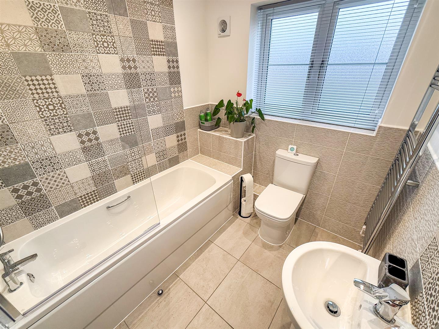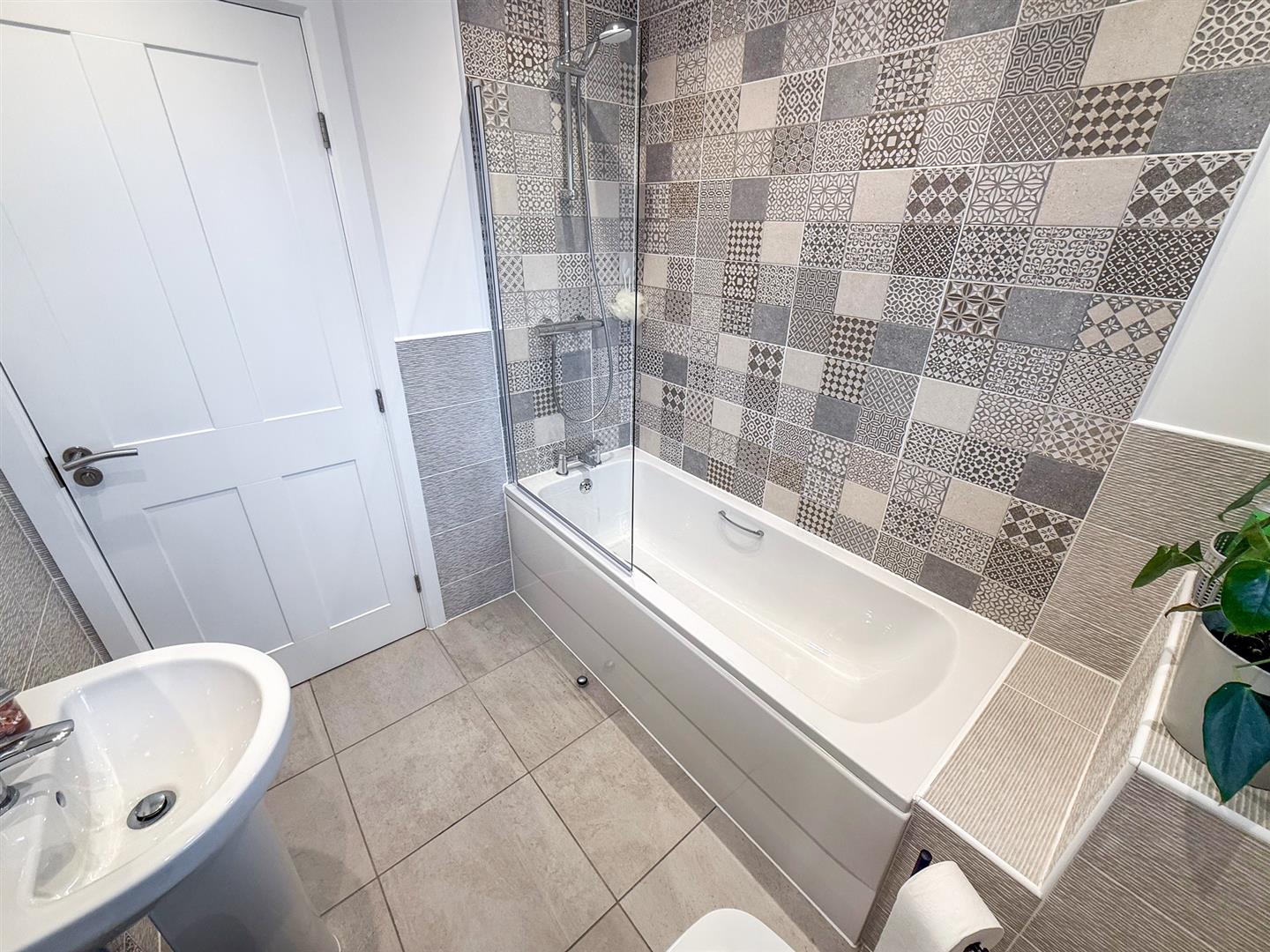 The well appointed family bathroom has panelled bath with shower over and glass screen and part tiled walls. A low level w/c, wash hand basin, heated towel rail and tiled floor. There is a window to the rear, beautiful tiled walls, an extractor fan, spot lighting and a shaver point.