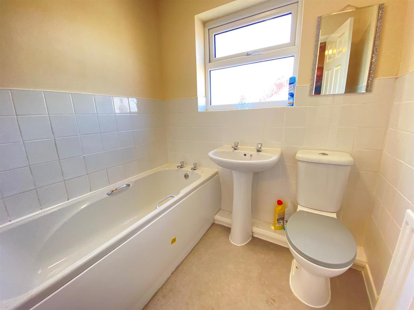 Family bathroom fitted with a three-piece suite comprising a panelled bath, pedestal wash hand basin, and low-level WC. The room is finished with part-tiled walls.